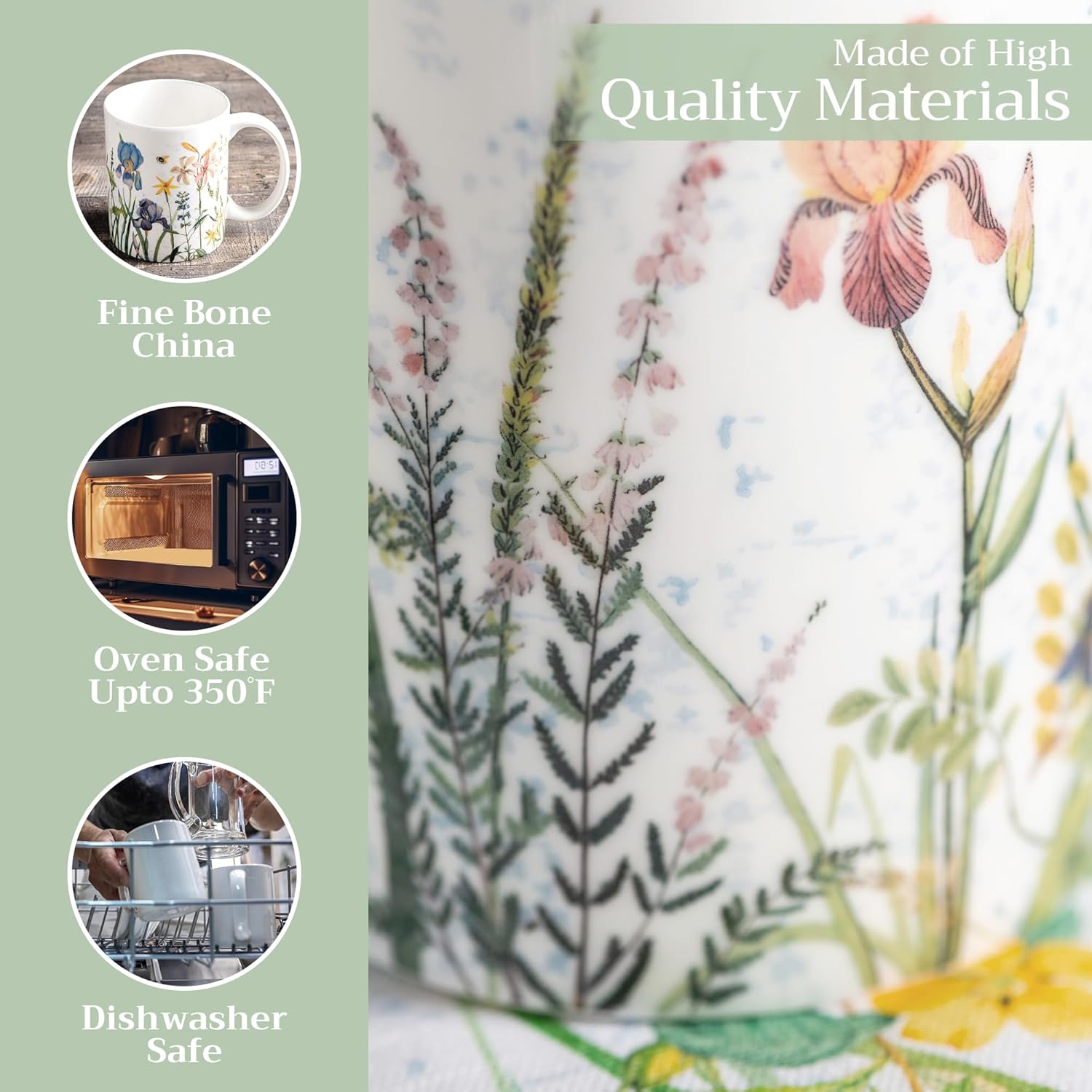 - Easy Care & Maintenance: Microwave, dishwasher, and oven safe up to 350°F. These bone china mugs are built for convenience and durability, making cleanup and reheating simple without compromising on quality