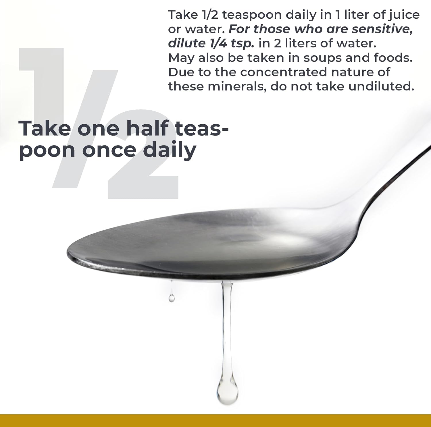 - OPTIMAL USAGE: Take 1/2 teaspoon of our mineral water drops daily in 1 liter of water or juice for regular use. For sensitive individuals, dilute 1/4 teaspoon in 2 liters of water