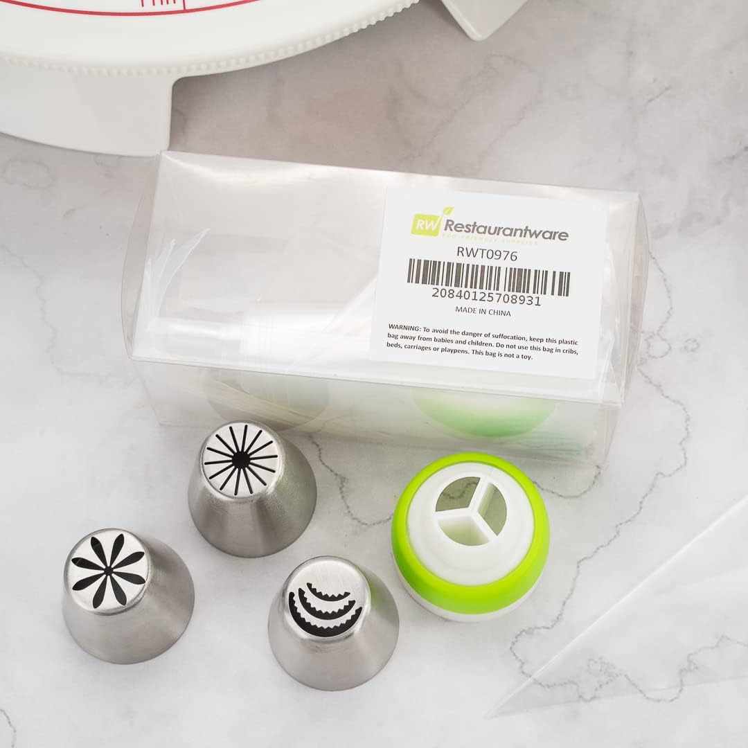 Restaurantware Pastry Tek Russian Piping Tips Set 20 Piece Durable Cake Decorating Kit - 9 Piping Tips 10 Piping Bags Stainless Steel Piping Bags And Tips Set 1 Tri-Color Coupler
