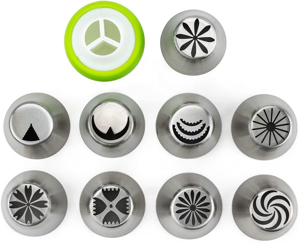 - ALL THE TOOLS YOU NEED TO DECORATE: This piping tip set brings 9 Russian piping tips, 10 piping bags, and 1 tri-color coupler so you can frost a variety of designs and flowers on cakes.