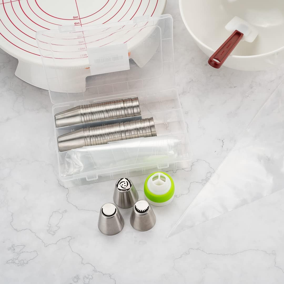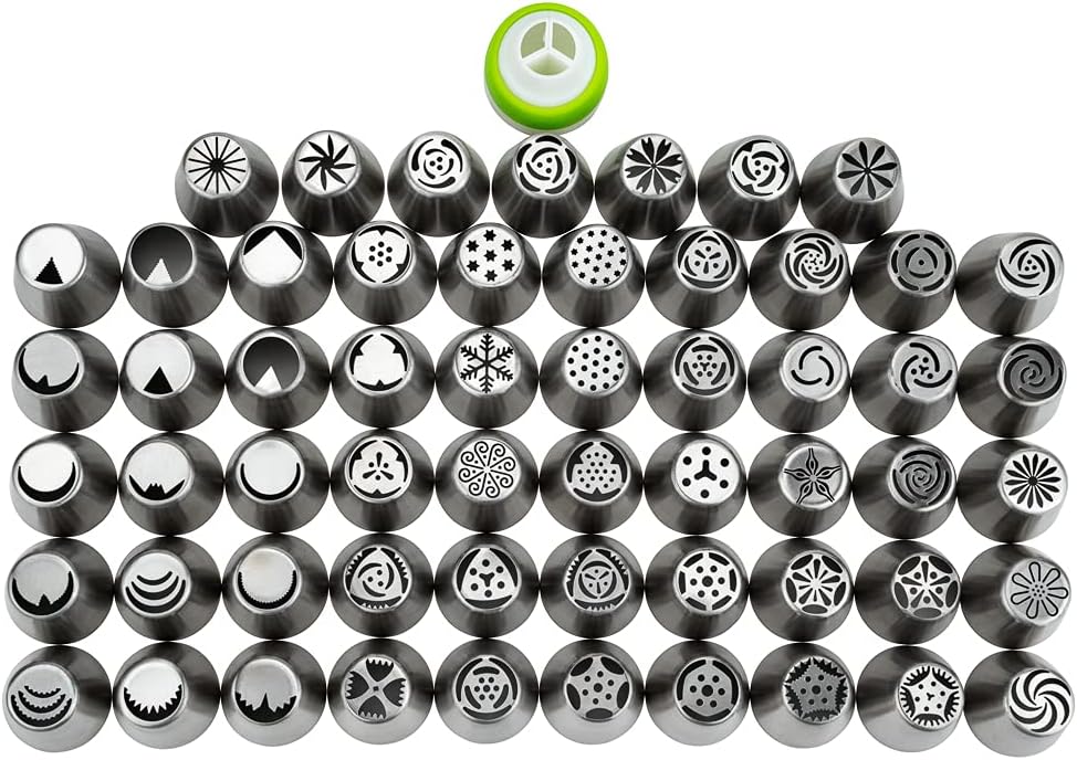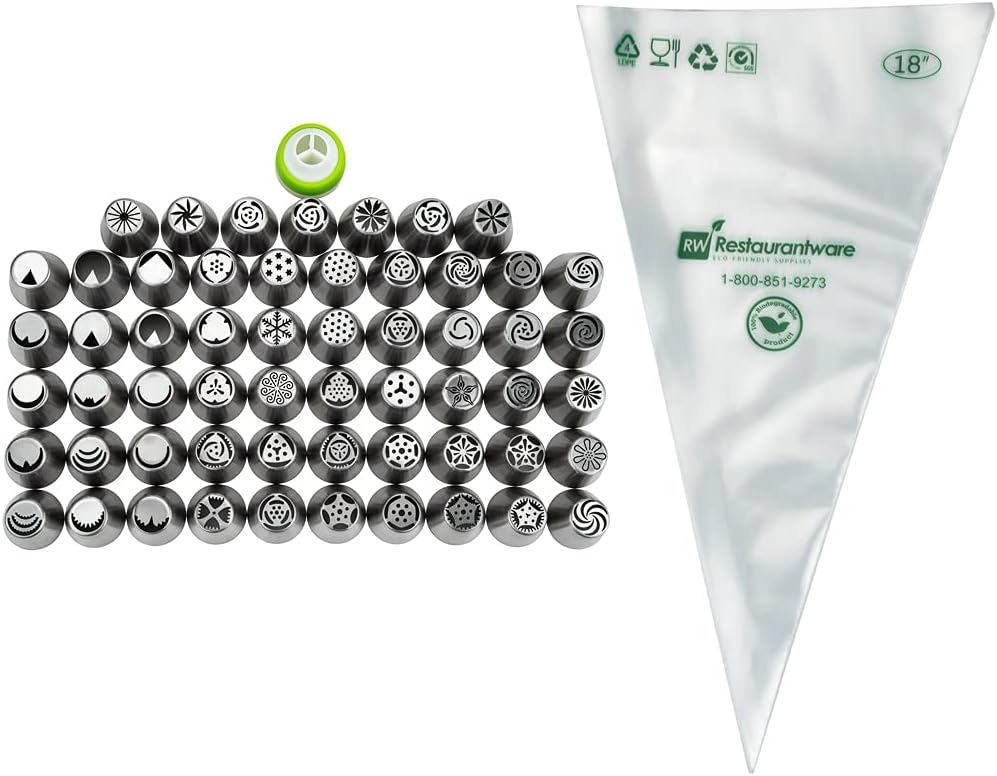 - ALL THE TOOLS YOU NEED TO DECORATE: This piping tip set brings 57 Russian piping tips, 10 piping bags, and 1 tri-color coupler so you can frost a variety of designs and flowers on cakes.