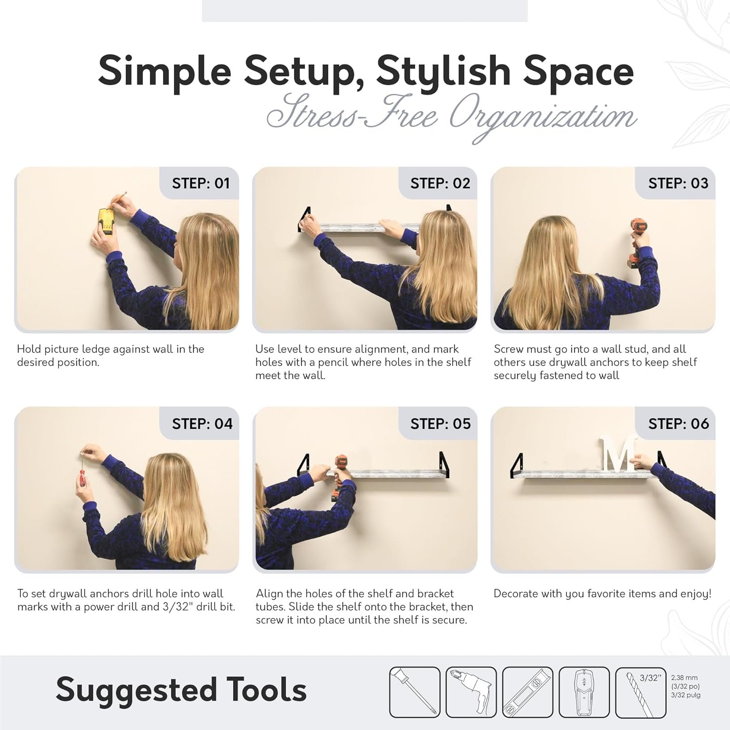 - EASY INSTALLATION Includes an EZ Anchor system, complete with hardware and detailed instructions, ensuring quick and hassle-free setup for your new wall mounted shelf.