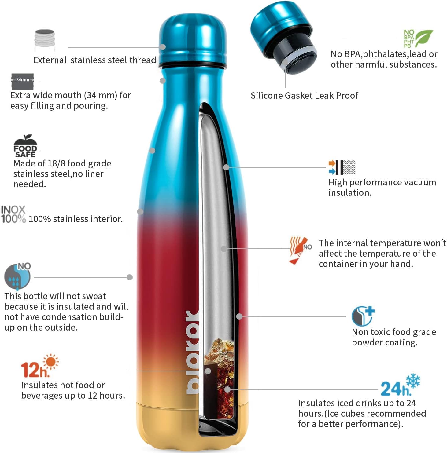 - Keep Drinks Cold & Hot: Adopt double wall vacuum insulation design, keep your drinks ice cold for 24 hours and hot for 12 hours within our highly performed insulated water bottle