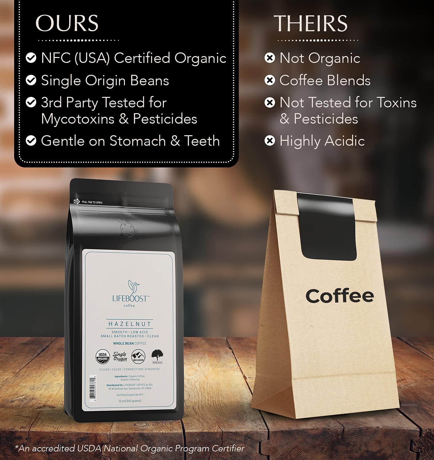 Lifeboost Hazelnut Whole Bean Coffee – Organic, Low Acid, Non-GMO Hazelnut Flavored Coffee – Single Origin, Mold-Free Mycotoxin Tested, 12 oz