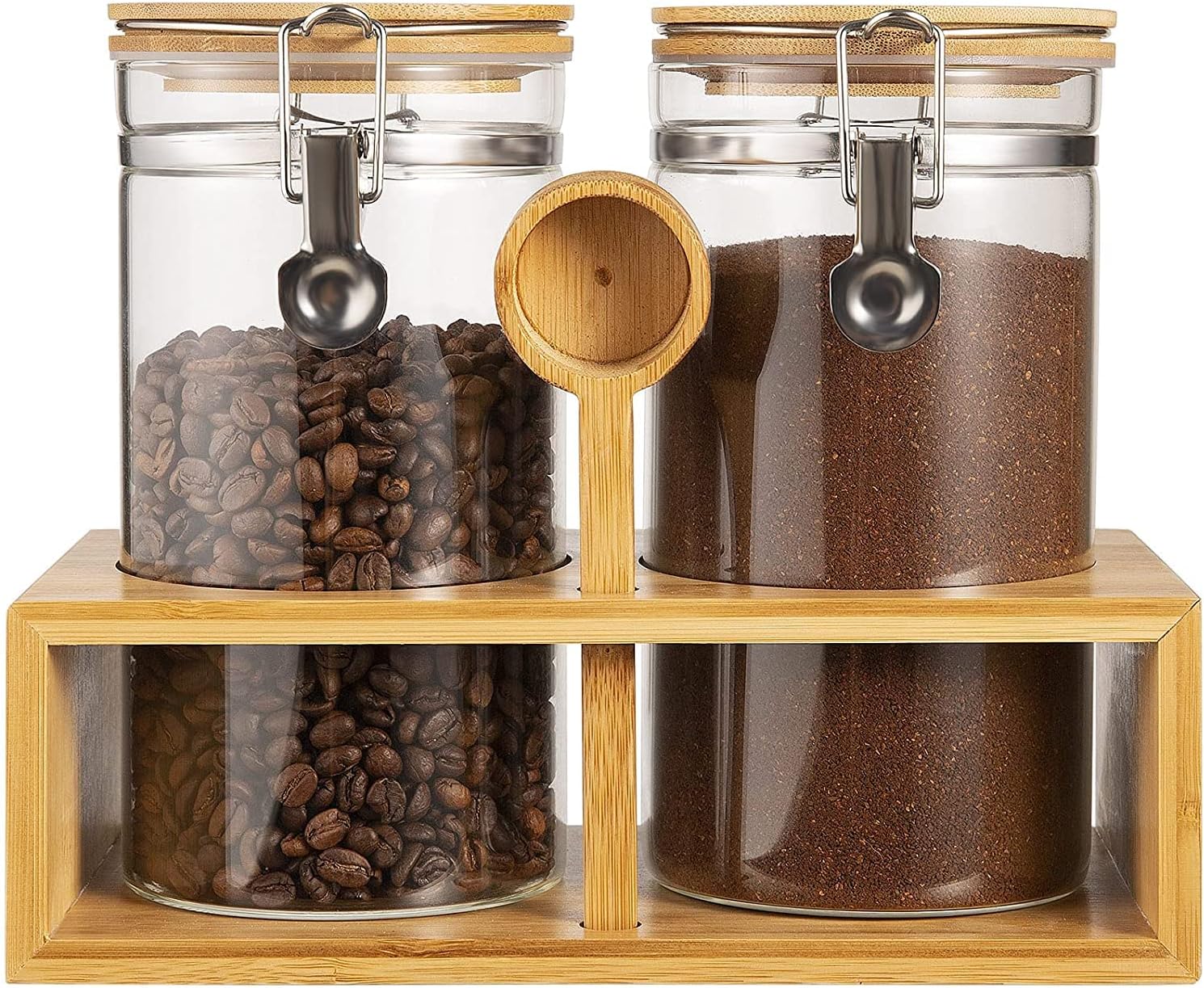 Yangbaga Ground Coffee Storage Container with Shelf, 2×45OZ Glass Coffee and Sugar Container Set, Coffee Canisters with Airtight Lids and Scoop, Food Storage Jars for Kitchen,Nuts,Tea,Sugar