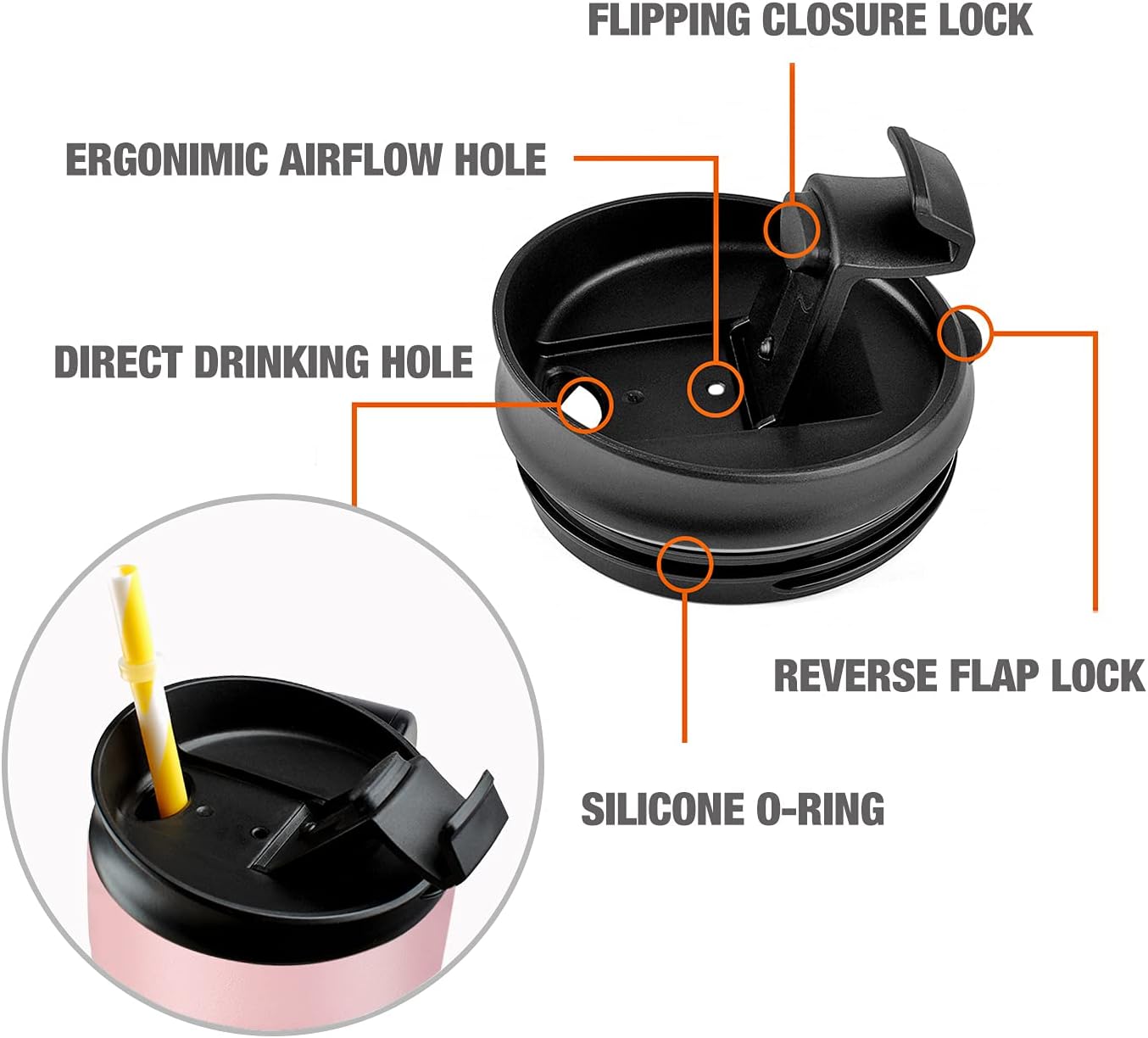 - Double Wall Insulation: The travel mug features double-wall insulation to ensure that your drink stays cold or hot for twenty-four and six hours, respectively. With the vacuum-insulated design, the bottle will not form condensation on the outside, reducing the potential to damage electronics