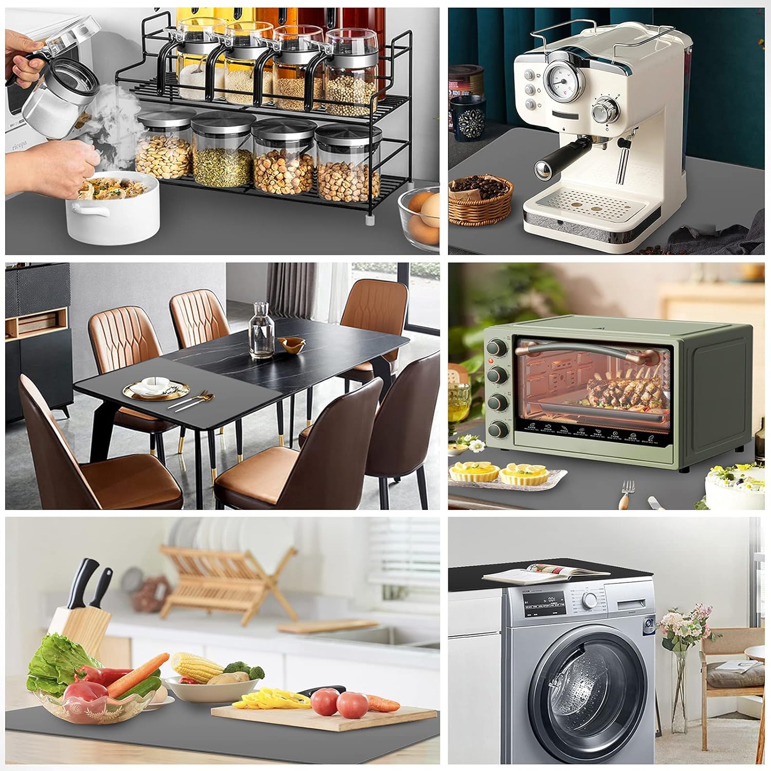 - You Can’t Go Wrong with It: This placemat can solve multiple problems. Great for catching messes. Protect counters from spills, scratches, grease, coffee stains, or damage. Place hot items of all sizes directly on the mat without having to dig through the drawer for a hot pad and no more need for trivets. Reduce the noises made by appliances. No need to worry about items slipping off the countertop. Tools will keep in place. Even if you are rolling dough hard on it, the mat won't slide