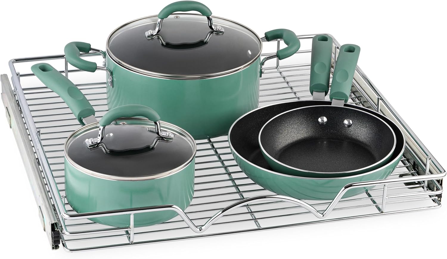 - HIGH QUALITY: Made of durable metal with chrome finish the pull out shelf for kitchen cabinet is simple and easy to install. Designed to fit any style of cabinetry and easy to clean.