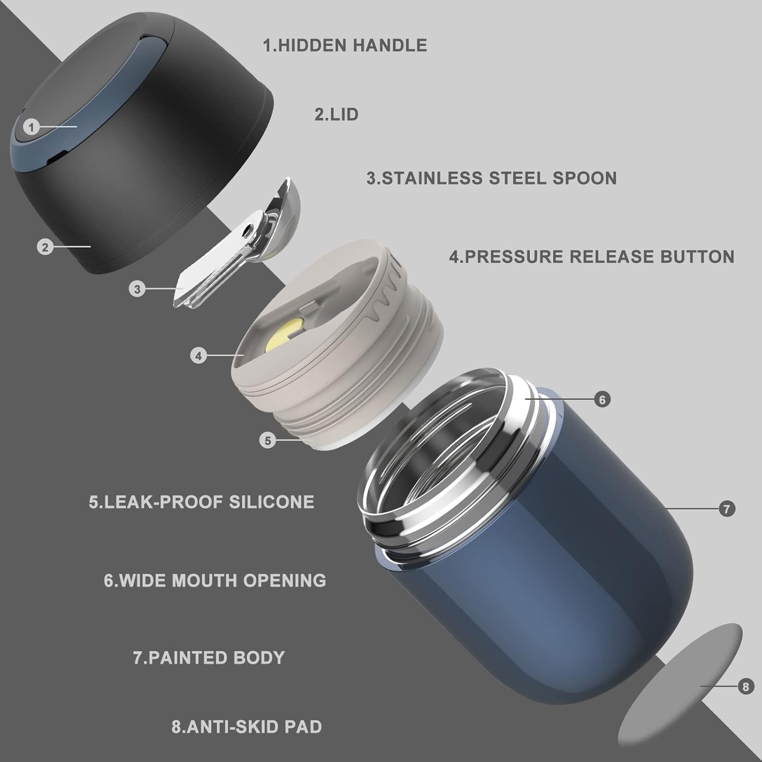 - Joopetalk thermo for hot food has an air pressure release button to help you easily open the bottle, and lunch thermo food jar is completely sealed, can prevent spilling accidents(100% Leak-Proof)