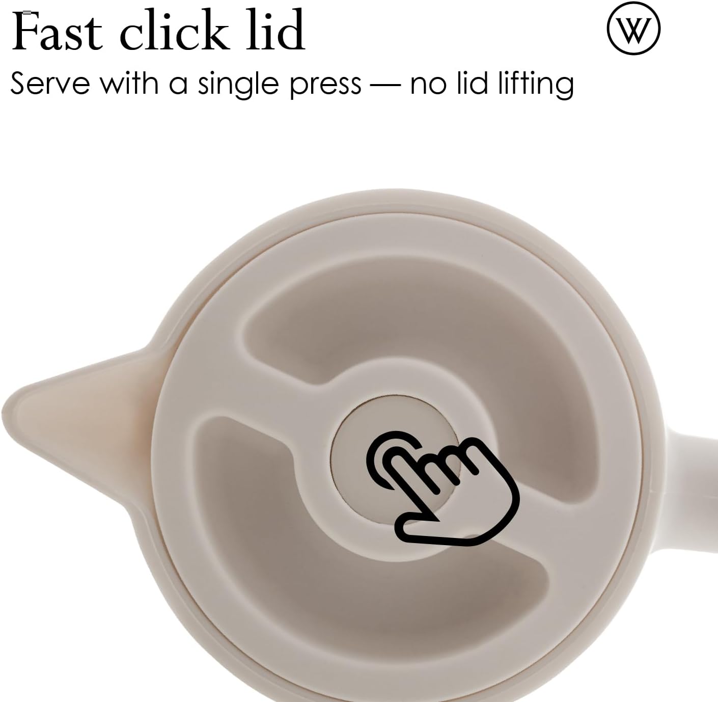 - 【ONE TOUCH POURING - NO NEED TO OPEN THE LID】Simply press the button on top to serve your drink effortlessly. The spout opens automatically, allowing for smooth, controlled pouring without removing the lid—helping maintain temperature and prevent heat or cold loss. No unscrewing needed!