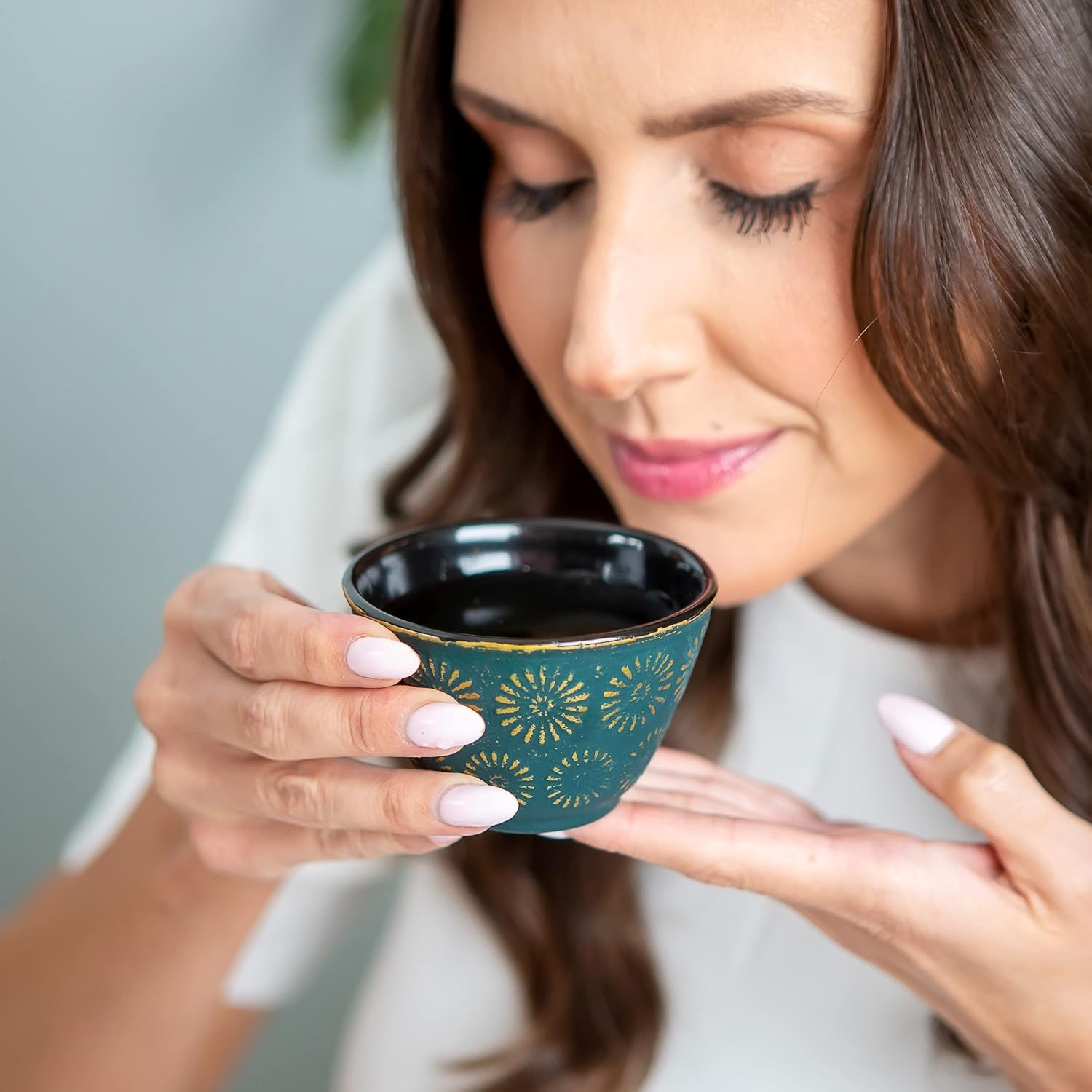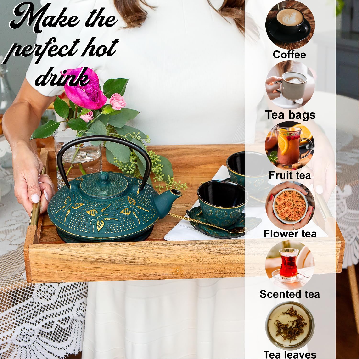 7PC Japanese Tea Set. "KIYOSHI Green" Cast Iron Tea Pot with 2 Tea Cups, 2 Saucers, Infuser and Teapot Trivet. Ceremonial Matcha Accessories
