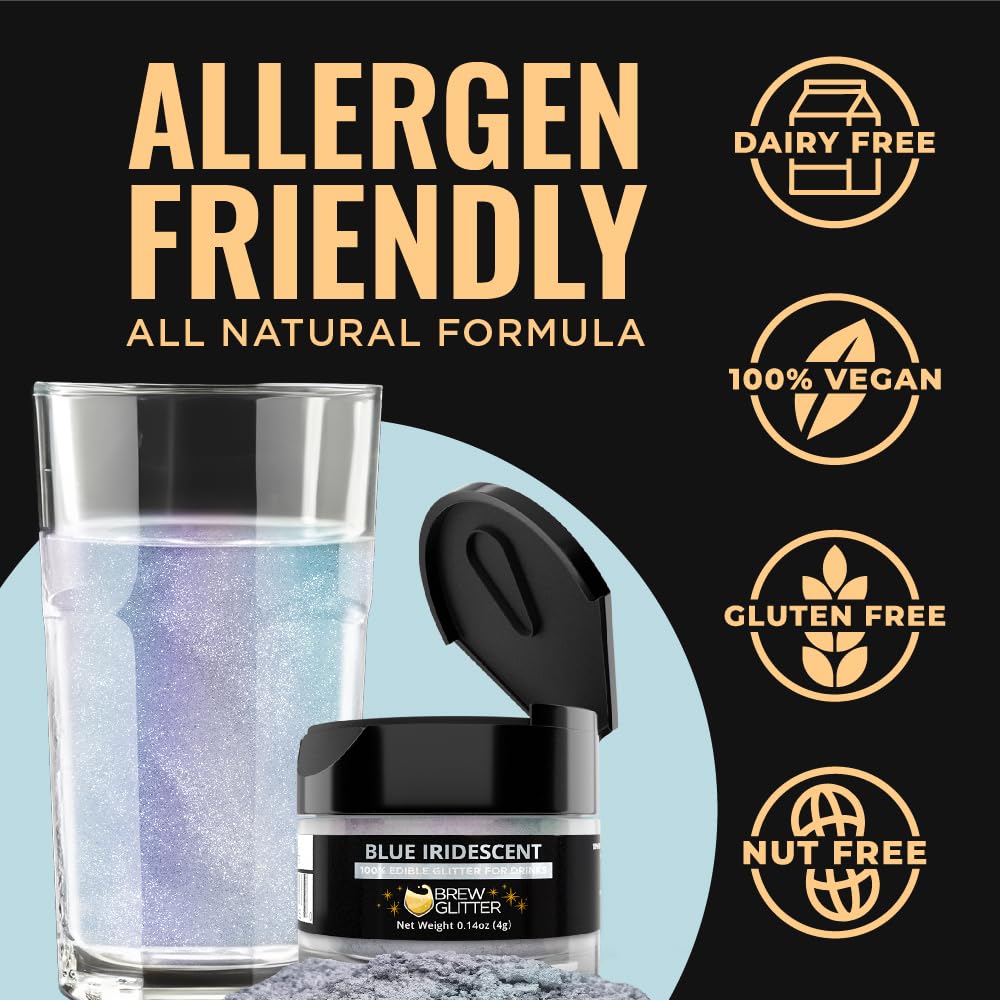 - 🌿 Brew Glitter iridescent blue drink glitter is made in the USA at SQF III, GMP, Halal, and Kosher certified facilities, and is nut-free, gluten-free, and vegan.