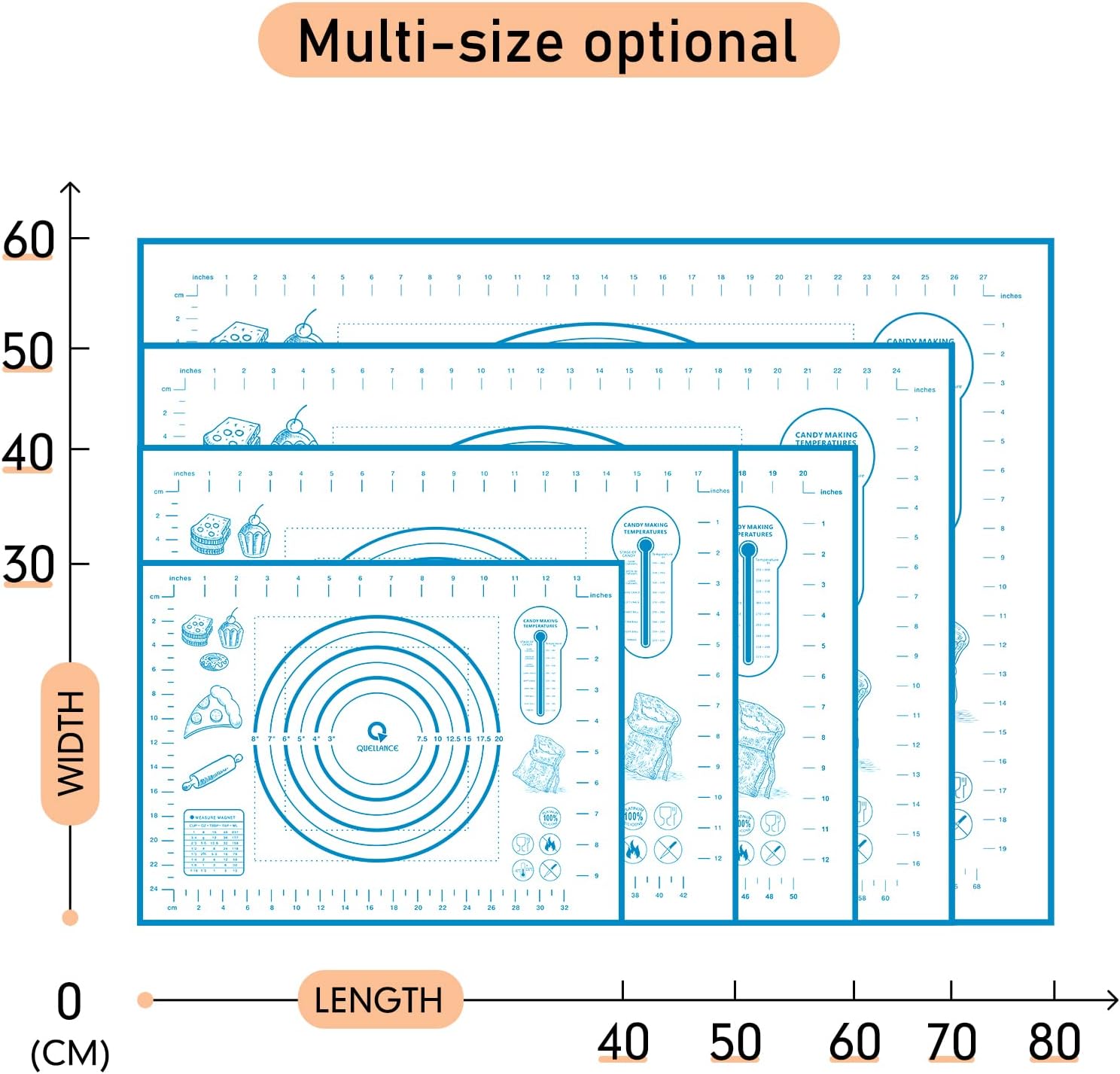 - 【Measurement Design for Precise Work】QUELLANCE silicone pastry mat with measurement equivalents, it is printed right on the edges of the pastry mat in both imperial and metric units. So this baking mat is really perfect to be pastry mat, counter mat, pizza mat, dough mat, fondant mat, rolling mat and placement mat.