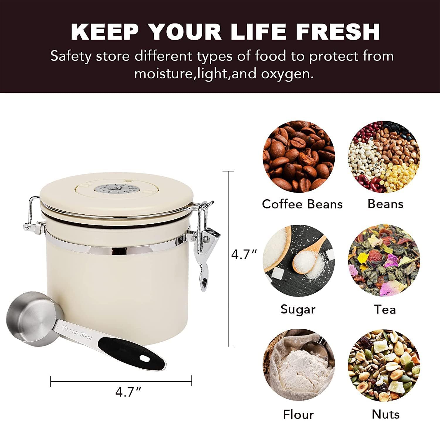 - 【BUILT-IN DATE TRACKER】A simple yet incredibly useful feature! The date tracker lets you monitor when the canister was last filled, helping prevent your coffee from going stale unnoticed. A stainless steel scoop is conveniently attached to the side, so you’re never left searching for a measuring spoon. Features a superior airtight seal for maximum freshness.