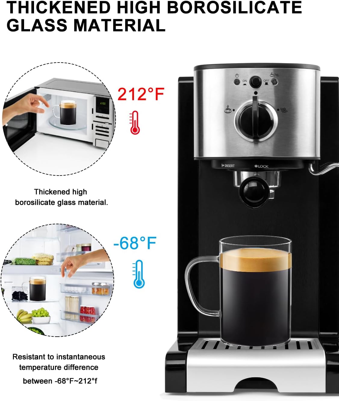 - DISHWASHER MICROWARE SAFE:This clear borosilicate coffee glasses can withstand sudden changes in the temperature difference between hot and cold temperature range(-68°F~212°F),It has extremely high heat resistance and explosion resistance,and is durable.So it can be safely used in dishwashers,microwaves and refrigerators,more durable to stand the daily use.