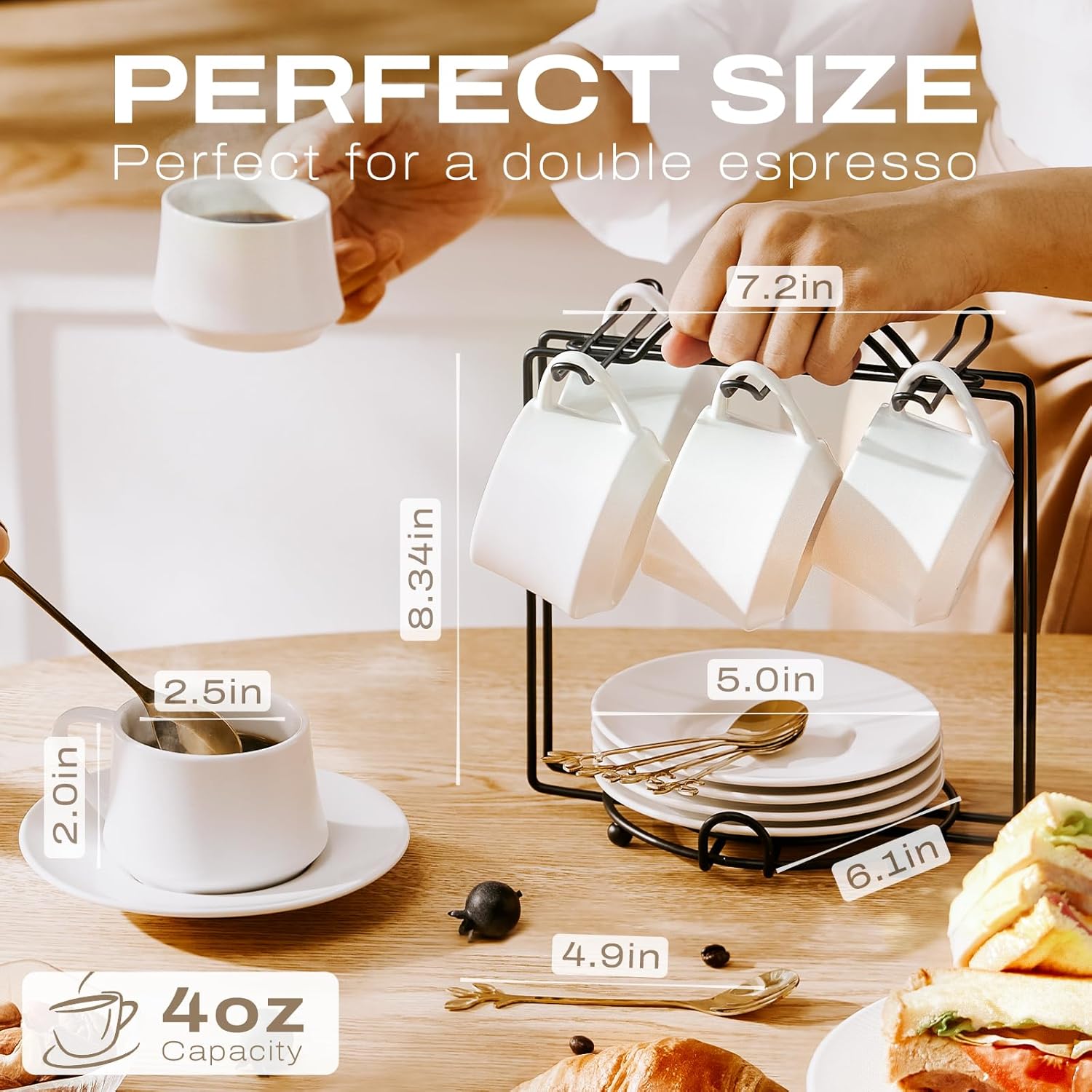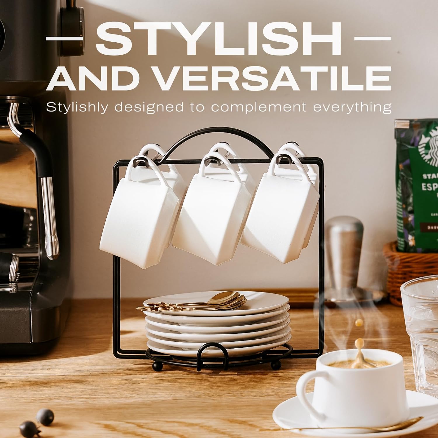- ๐๐ฎ๐ซ๐ง ๐๐จ๐ฎ๐ซ ๐๐จ๐๐๐๐ ๐๐จ๐ฎ๐ญ๐ข๐ง๐ ๐ข๐ง๐ญ๐จ ๐ ๐๐ข๐ญ๐ฎ๐๐ฅ ๐จ๐ ๐๐จ๐ฒ: This isn' t just a cup set - it' s an upgrade to your daily grind. The elegant saucers, spoons, modern metal stand, and timeless cafรฉ-inspired design transform your morning coffee into a moment of sophistication. Whether you' re savoring a weekday pick-me-up or hosting a weekend brunch, this set elevates the ordinary into something extraordinary.