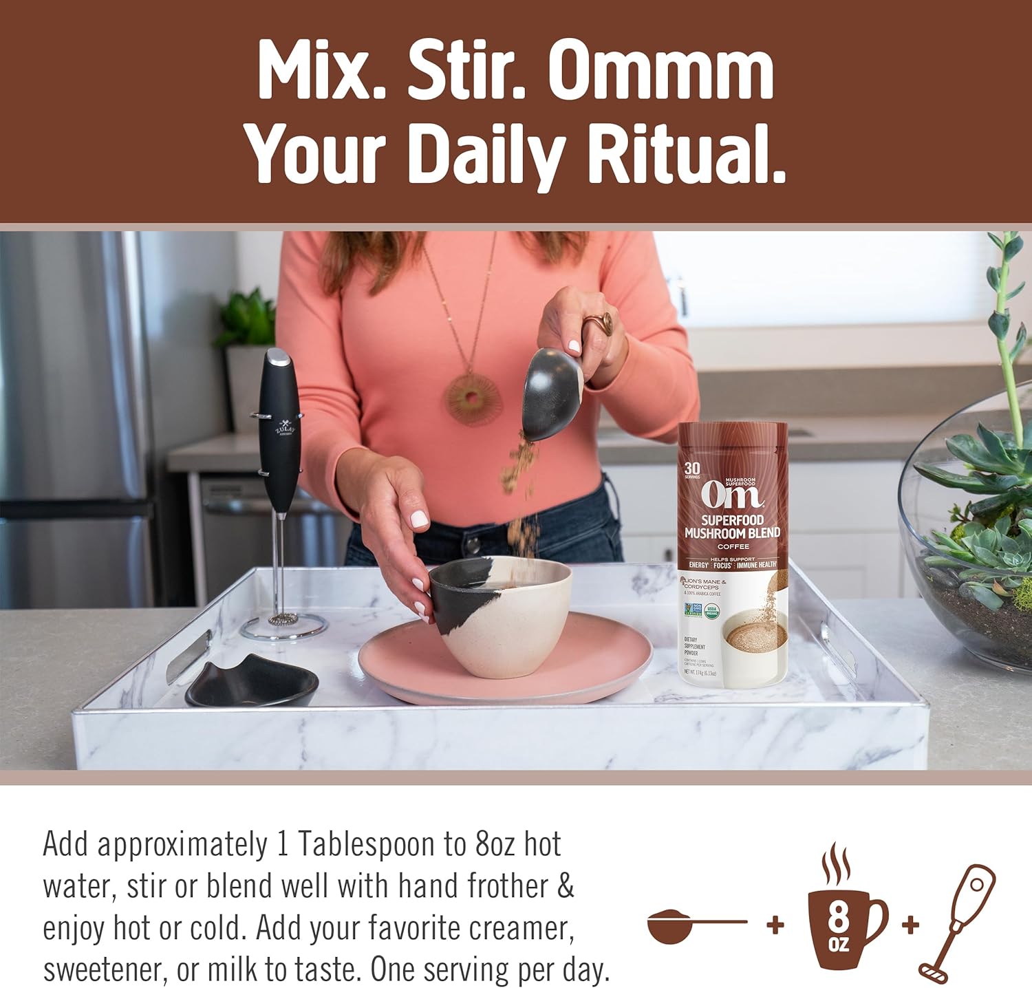 - Om Mushroom Superfood Coffee Blend Mushroom Powder Canister: Contains a 6.24 Ounce canister, 30 servings, of an energizing combination of rich bold tasting organic coffee with functional mushrooms for immune, energy and focus related benefits