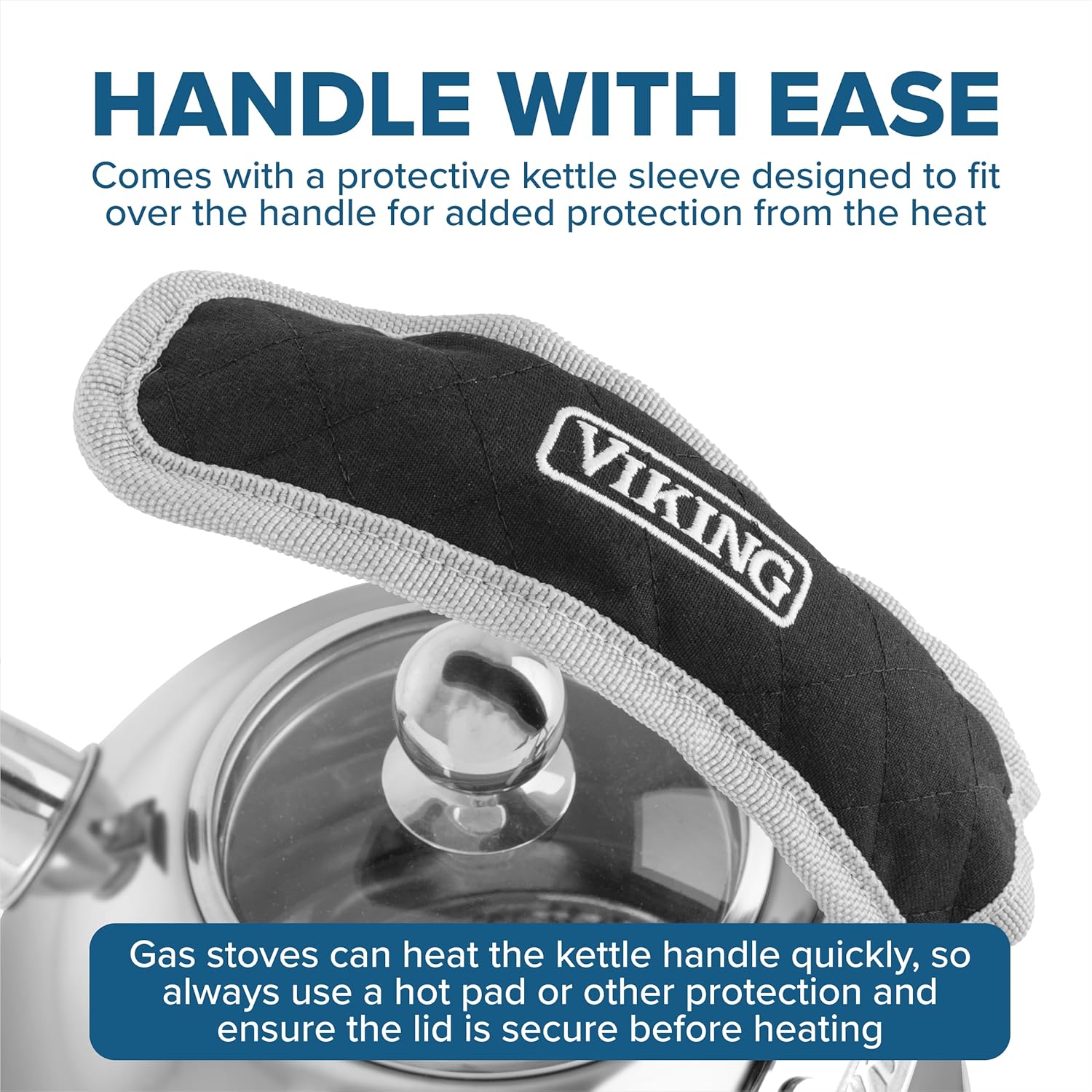 Viking 3-Ply Stainless Steel Tea Kettle, 2.6 Quart Stovetop Hot Water Pot with Tempered Glass Lid, Ergonomic Handle, Induction Ready, Satin Silver