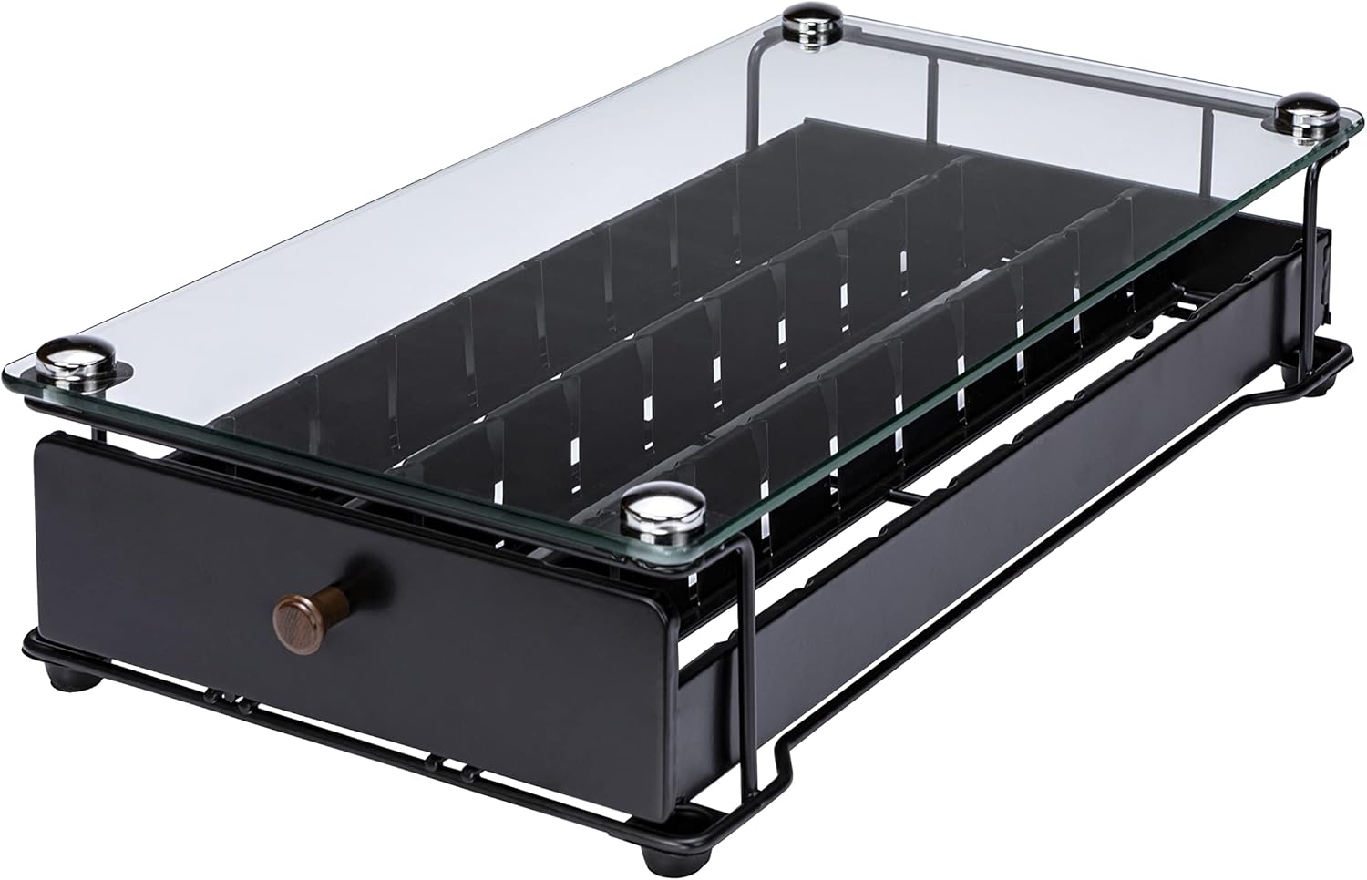 - [The Design You Like] 0.16'' thick tempered glass instead of iron for top of the pods holder,more durable and longer lifespan. Iron wire instead of foot holder as the feet of organizer,bear more pressure. Anti-derailed track design,more convenient to pull and push.
