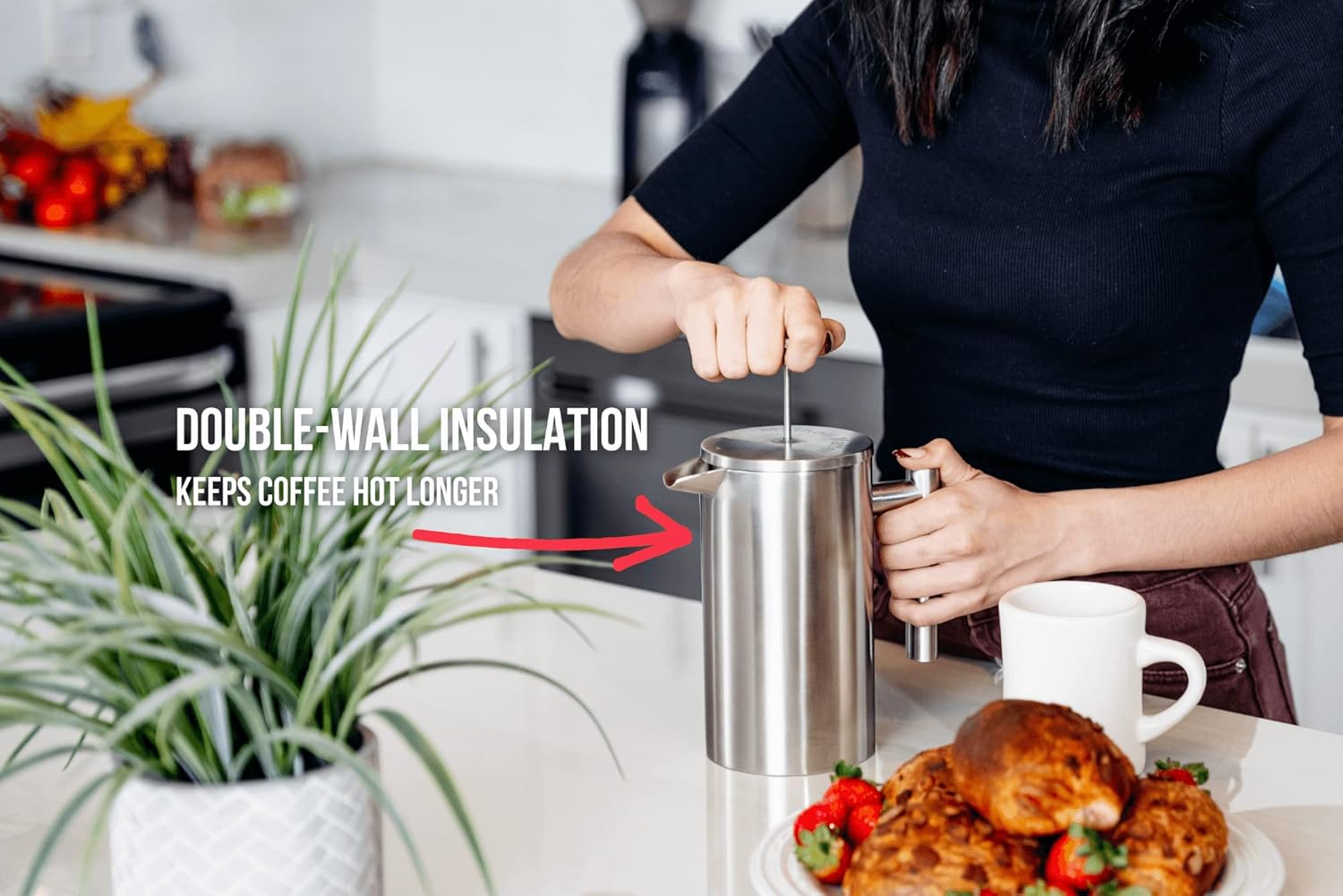 - BARISTA QUALITY. Made from premium food grade stainless steel, our insulated French press kit is durable and rust-proof. It has a sleek modern design with a stay-cool handle that makes lifting and pouring a breeze. We even included a free wood barista spoon. Stirring the grounds during the brew disperses the coffee grounds for even extraction and balanced flavors. A coffee press that will surely look good in your kitchen and makes a lovely gift to your loved ones!