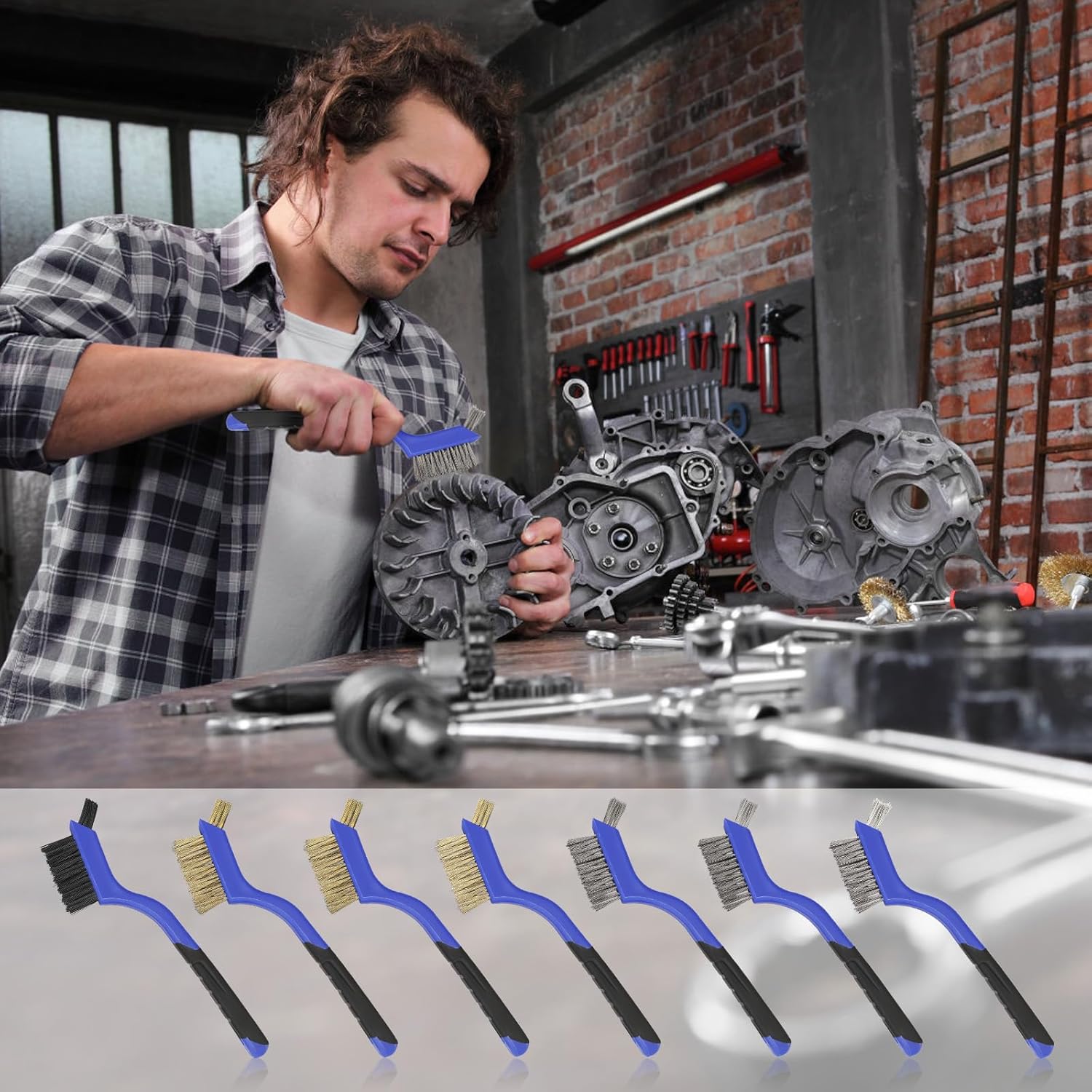 Wire Brushes Pack of 7. for Cleaning Welding Slag, Rust and Dust. 7" Brass, Stainless Steel, Nylon Brushes with Rigid Handle