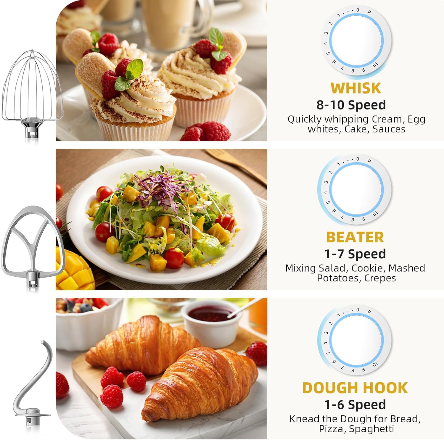 - Greater Control Over 10+P Speeds: Peicual electric stand mixer provides you with a superior mixing performance experience. 6 different speed options, make the blending action thorough and fast, easy to the various recipe such as cakes, bread, cookies, salads, muffins, etc. Use the PULSE function to provide precision control when required a quick burst of power.