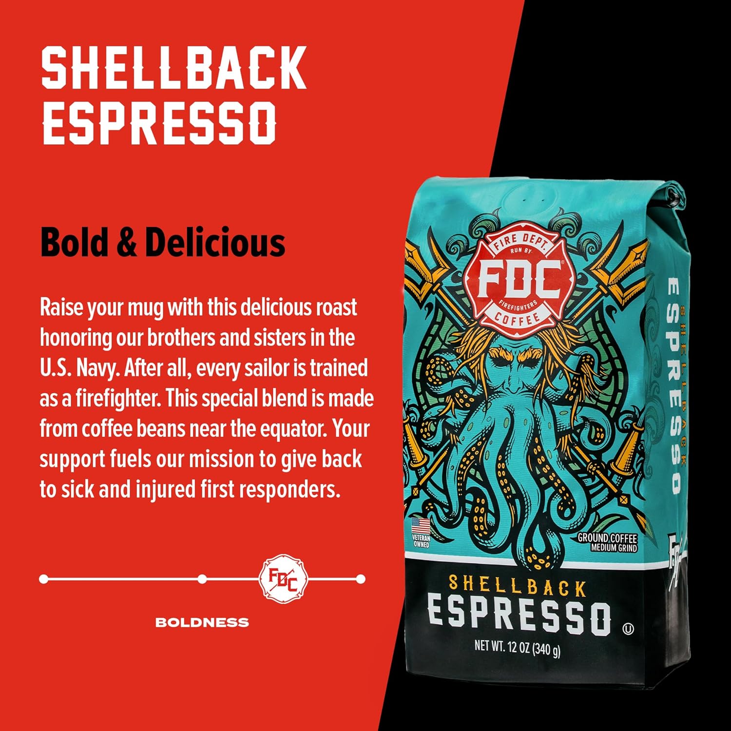 Fire Department Coffee - Gives Back to Firefighters - Bold & Smooth Shellback Espresso Ground Coffee - Roasted in the USA - Veteran Owned - 12 oz