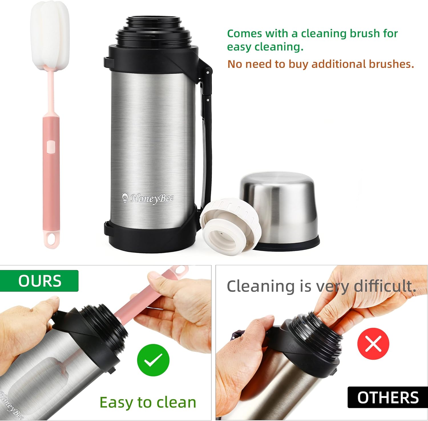 HoneyBee 41 Ounce,Vacuum Insulated Bottle,Coffee Thermos,Thermos for Hot Drinks. Twist and Pour TopThermos & Cleaning Brush. Commute, Travel, and Picnic Friendly Portable.Bpa-Free .(Silver)