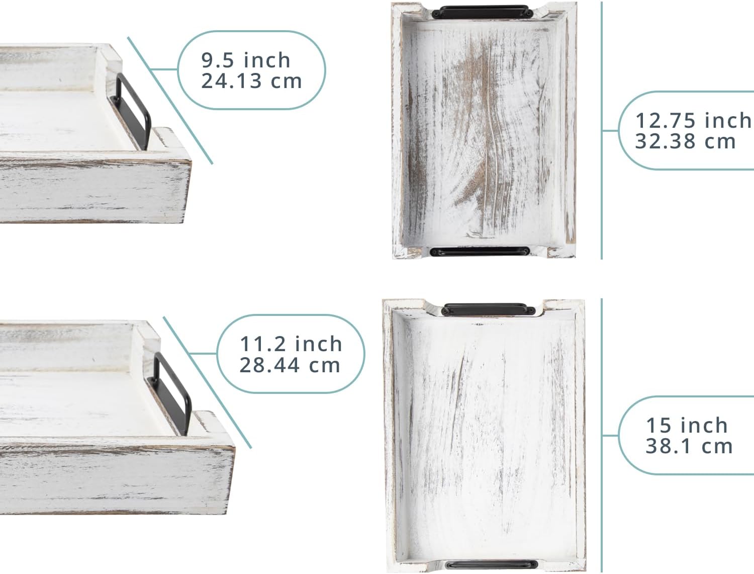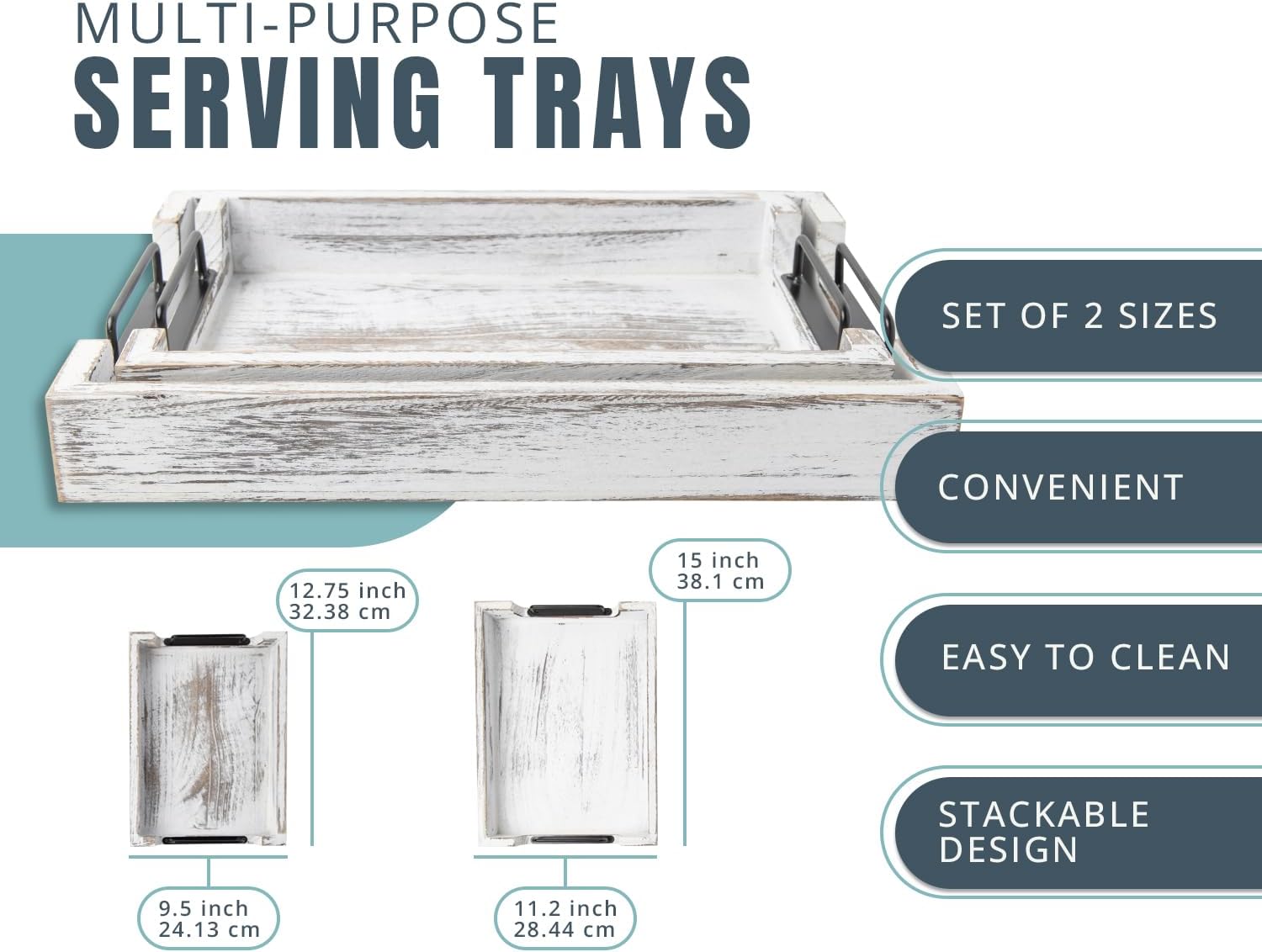 Rustic Wooden Serving Trays with Handle - Set of 2 - Large and Small Nesting Multipurpose Trays - for Breakfast, Coffee Table/Butler & More - Rustic White