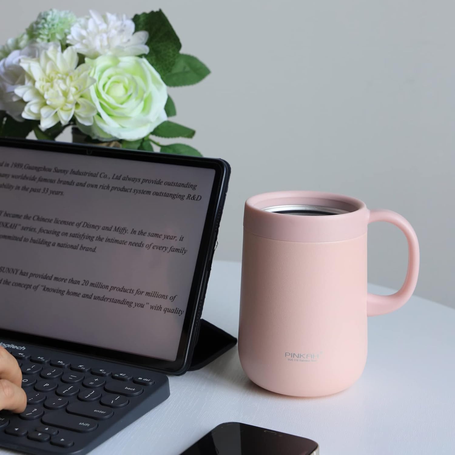 Stainless Steel Coffee Mug with Lid and Handle, Double Wall Vacuum Insulated Cup, 16oz, Pink
