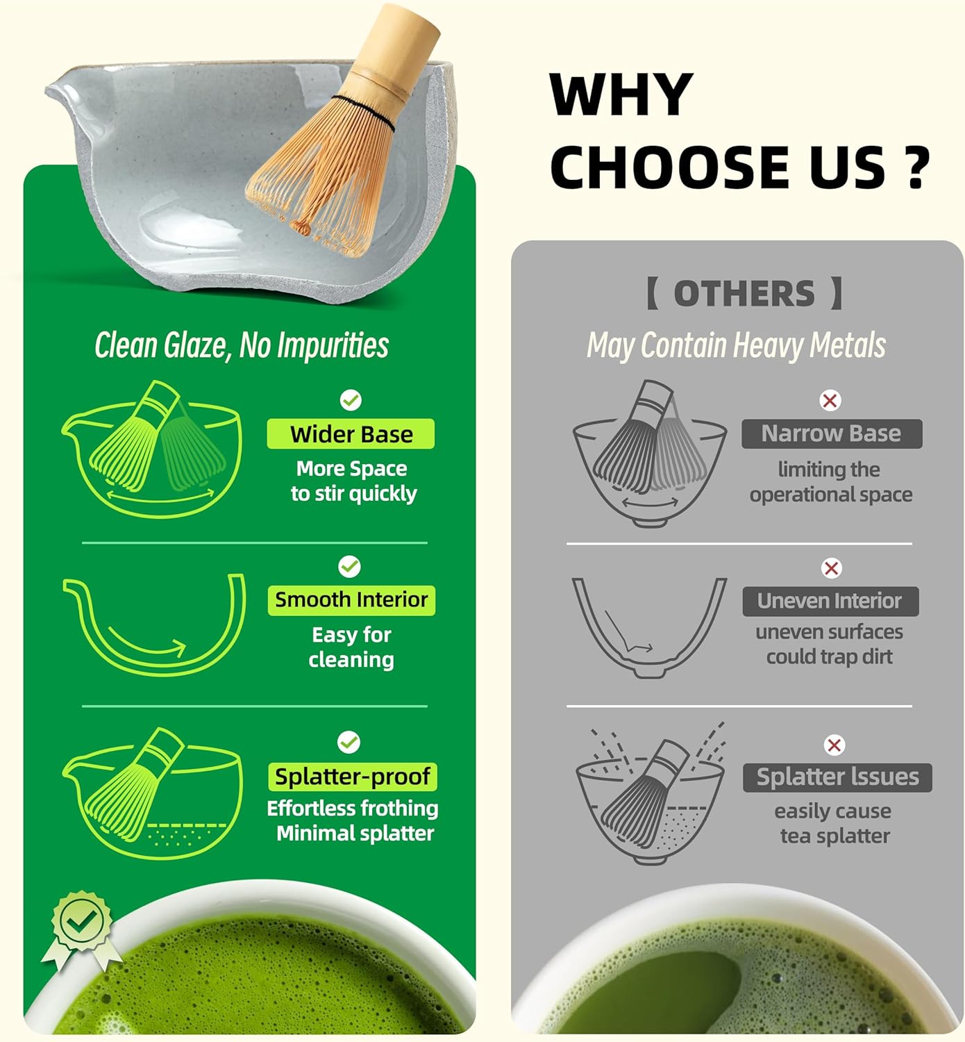- HIGH SAFETY & QUALITY: Our Handcraft Matcha Whisk, About 100 Fine Tines(百本立),100% Crafted From High Quality Bamboo With A Vegetable Oil Finish To Enhance Its Durability. Additionally, Our Ceramic Bowl Has Lead-free And Mercury-free Test Reports.food-grade And Eco-friendly