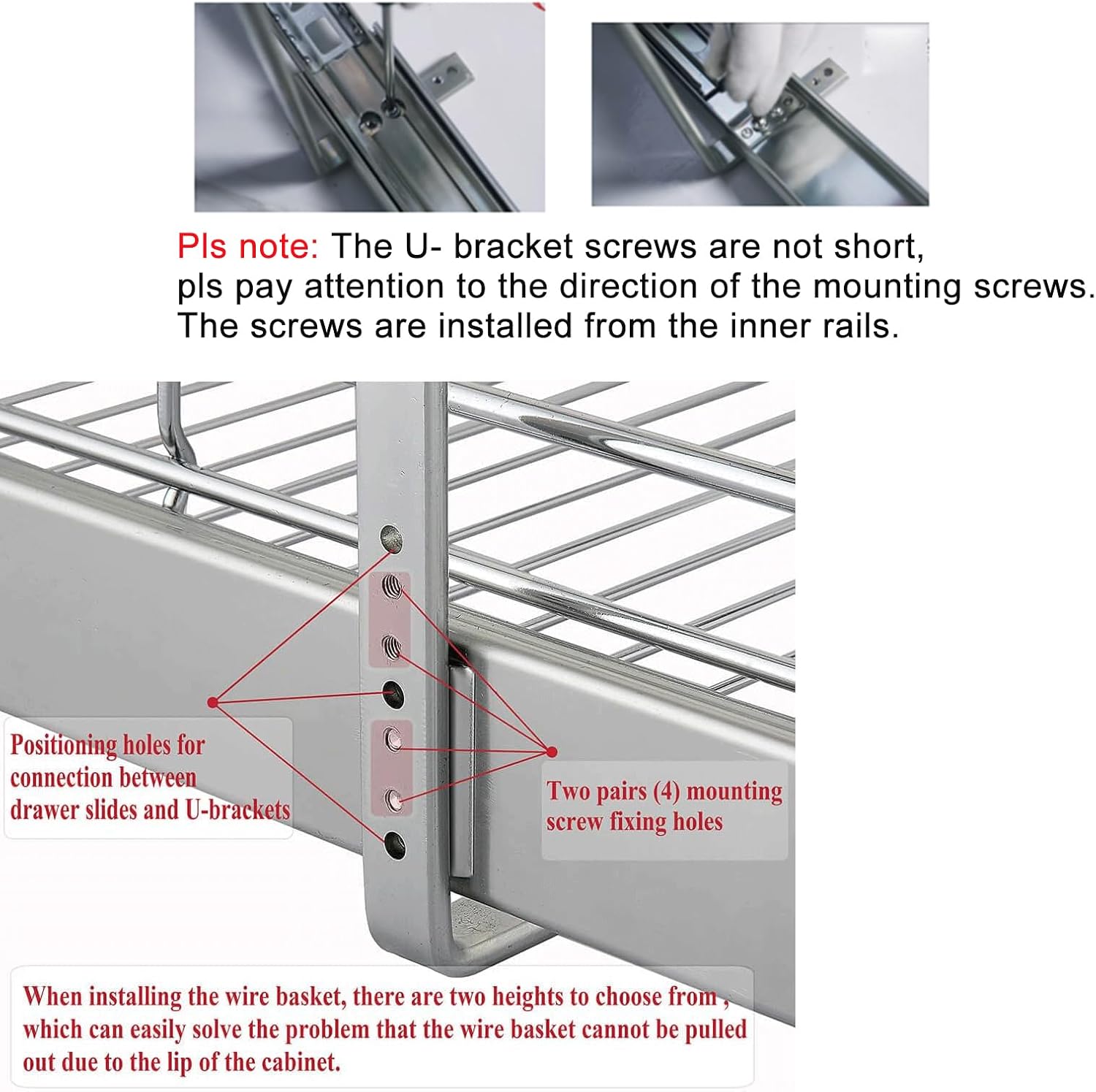 - 👍Easy to Install: This 2 tier shelf --- 👍Overall Size is 11" W X 21" D, 👍The Basket Size is 9.5" W X21"D X2.3"H , this 2 tier slide out cabinet organizer needs more than 11" W net width cabinet openings,net width measure from the hinges. Min cabinet interior depth: 22.5 inch. Rear mounting brackets are optional and can be used or not. Pls note: The U- bracket screws are not short, pls pay attention to the direction of the mounting screws, the screws are installed from the inner rail. Watch the installation videos if you have any questions, they explain it all.