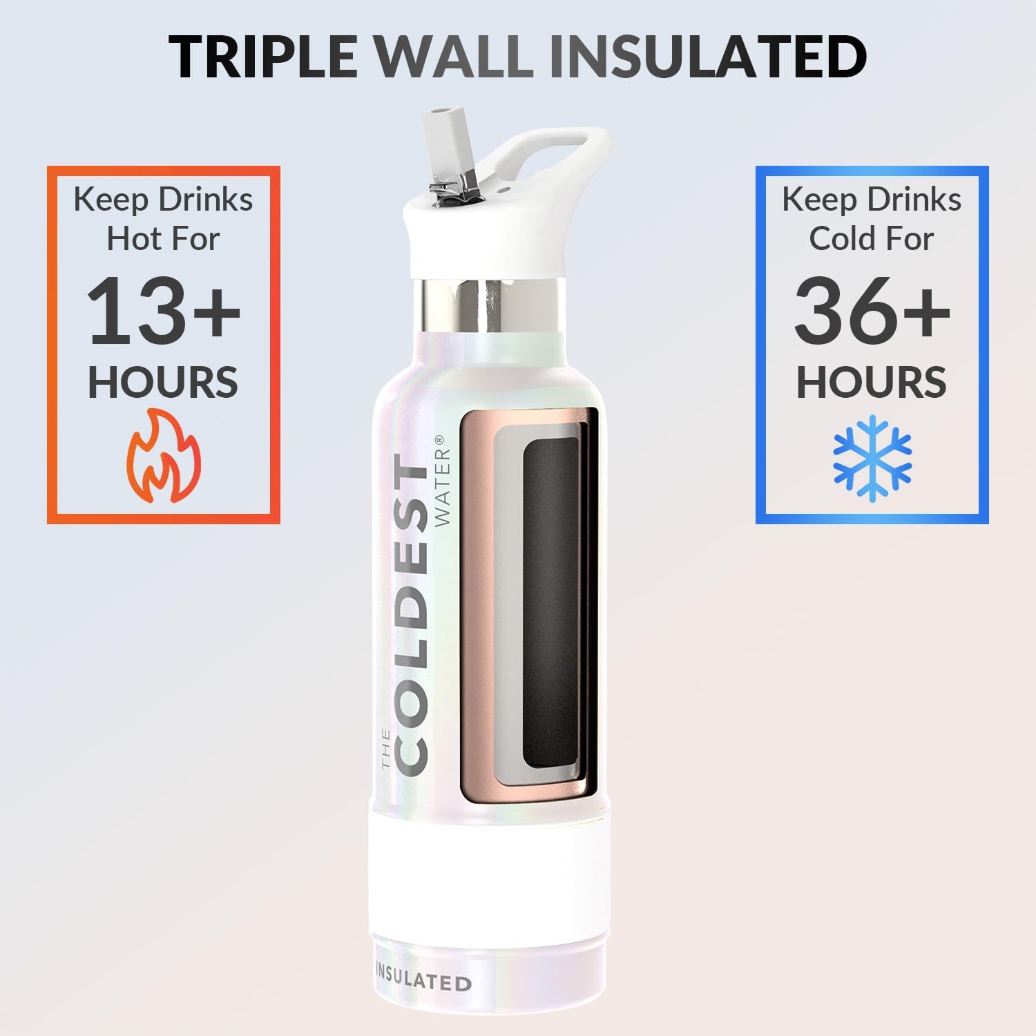 - 𝐀𝐃𝐕𝐀𝐍𝐂𝐄𝐃 𝐈𝐍𝐒𝐔𝐋𝐀𝐓𝐈𝐎𝐍 𝐓𝐄𝐂𝐇𝐍𝐎𝐋𝐎𝐆𝐘: Coldest reusable water bottles are your solution to tepid sips. With the world's first fully insulated straw lid, this bottle keeps your drink cold for 36+ hours and hot for 13+ hours, ensuring your drink stays at the perfect temperature throughout the day. Cold-tested against 50+ leading brands, its superior performance guarantees an unmatched experience. Upgrade now to the Coldest Water Bottle and bid farewell to temperature woes.