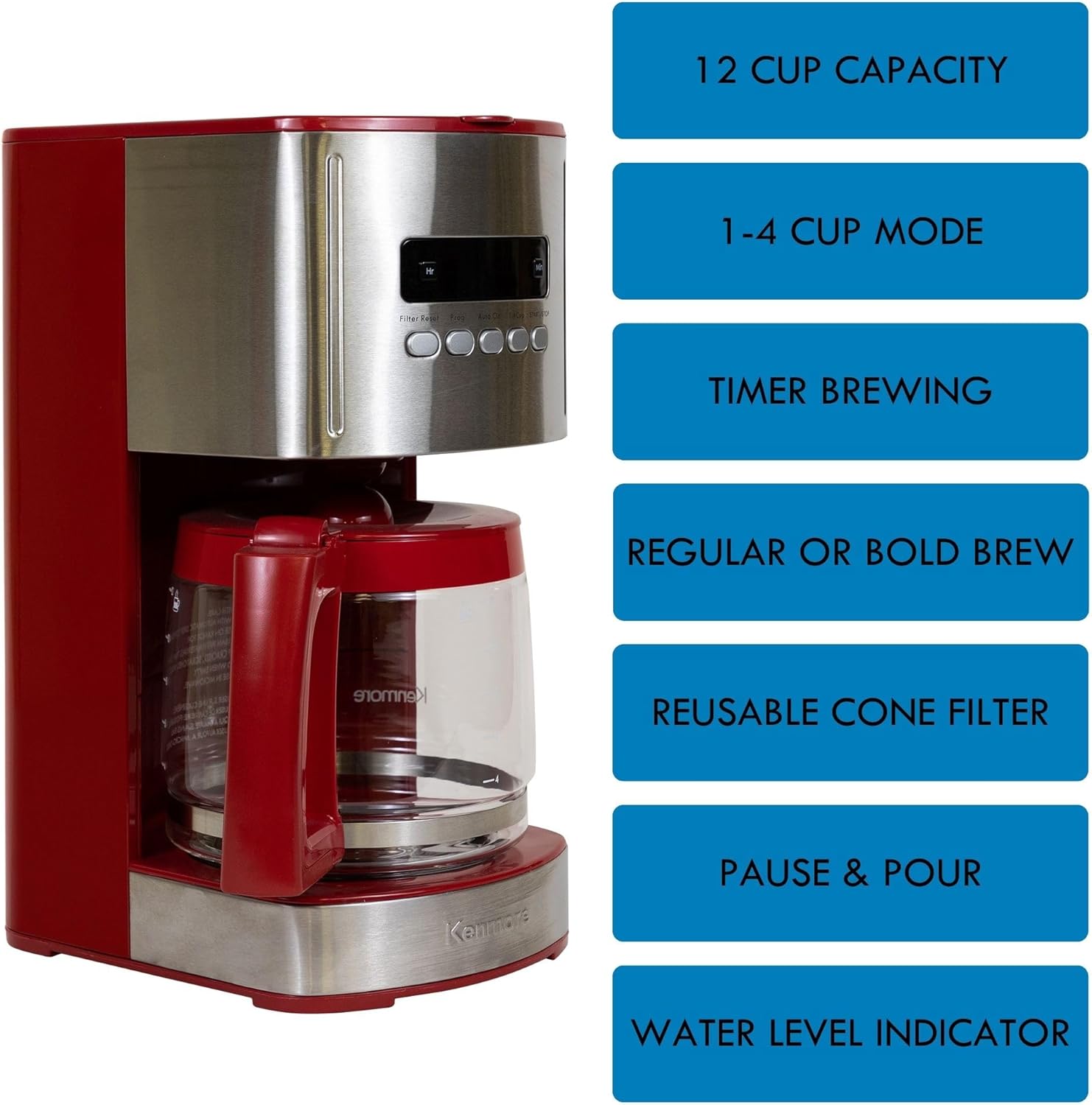 - LARGE 12-CUP CAPACITY - Brew up to 1.8 liters (1.9 quarts) of coffee into the dishwasher-safe glass carafe. For smaller servings, select the 1-4 cup mode. This versatile Kenmore Coffee Maker is Impeccable for both large gatherings & personal use, ensuring you always have the right amount of coffee.