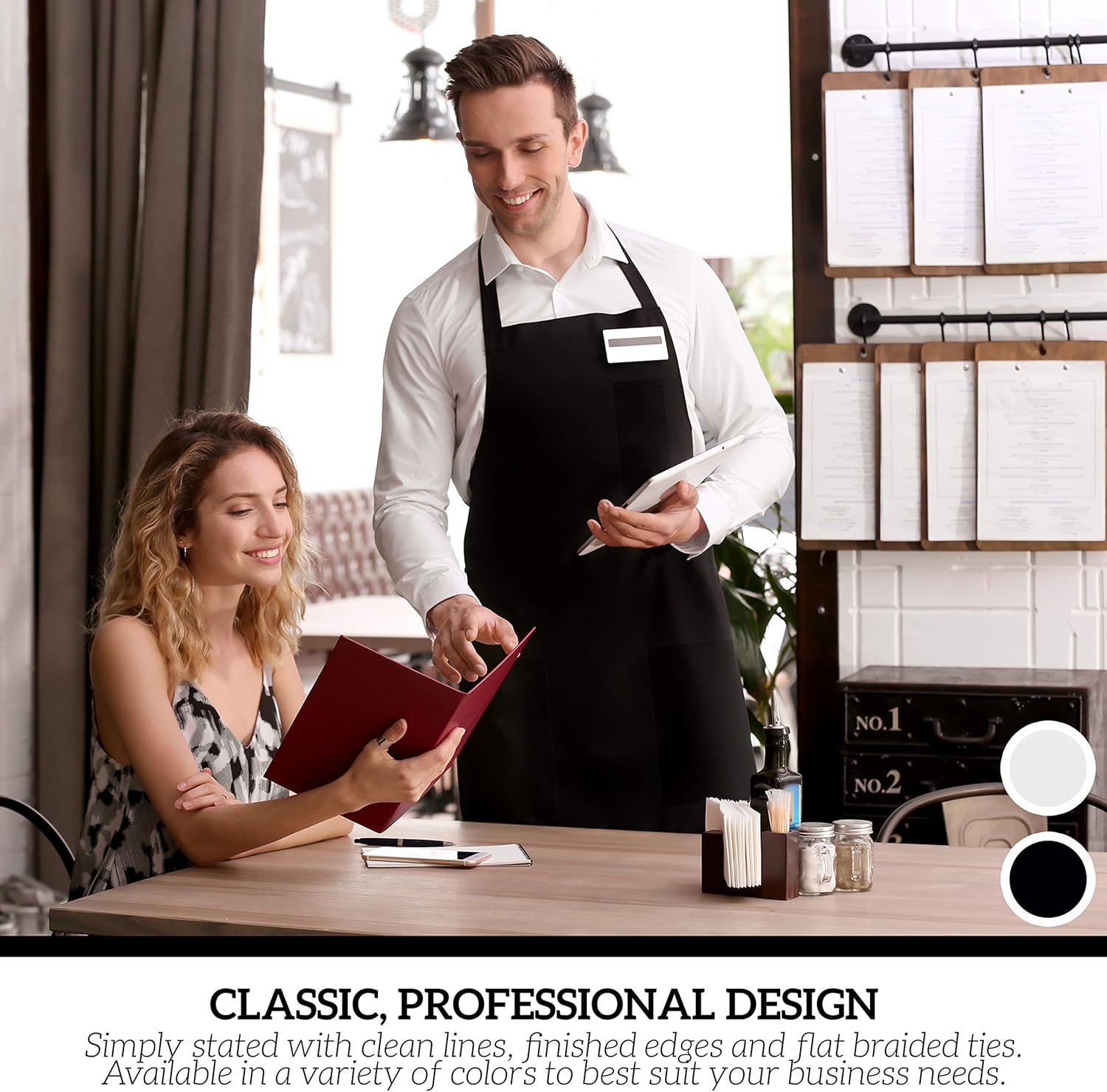 - Uniform Style, Custom Look – Available in multiple colors, these aprons bulk are perfect for creating a clean, coordinated look across your team. Whether you're outfitting a restaurant, salon, or café, you can match your aprons to your brand and keep every employee looking sharp and on-theme.