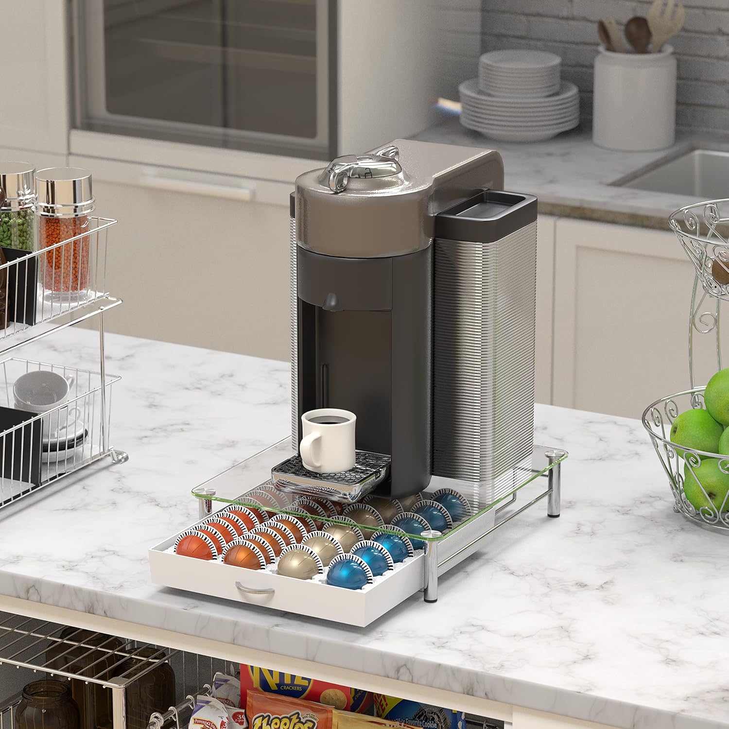 DecoBrothers Crystal Tempered Glass Vertuo Pod Holder Drawer, 24 Large or 48 Small Nespresso Capsule Organizer, White
