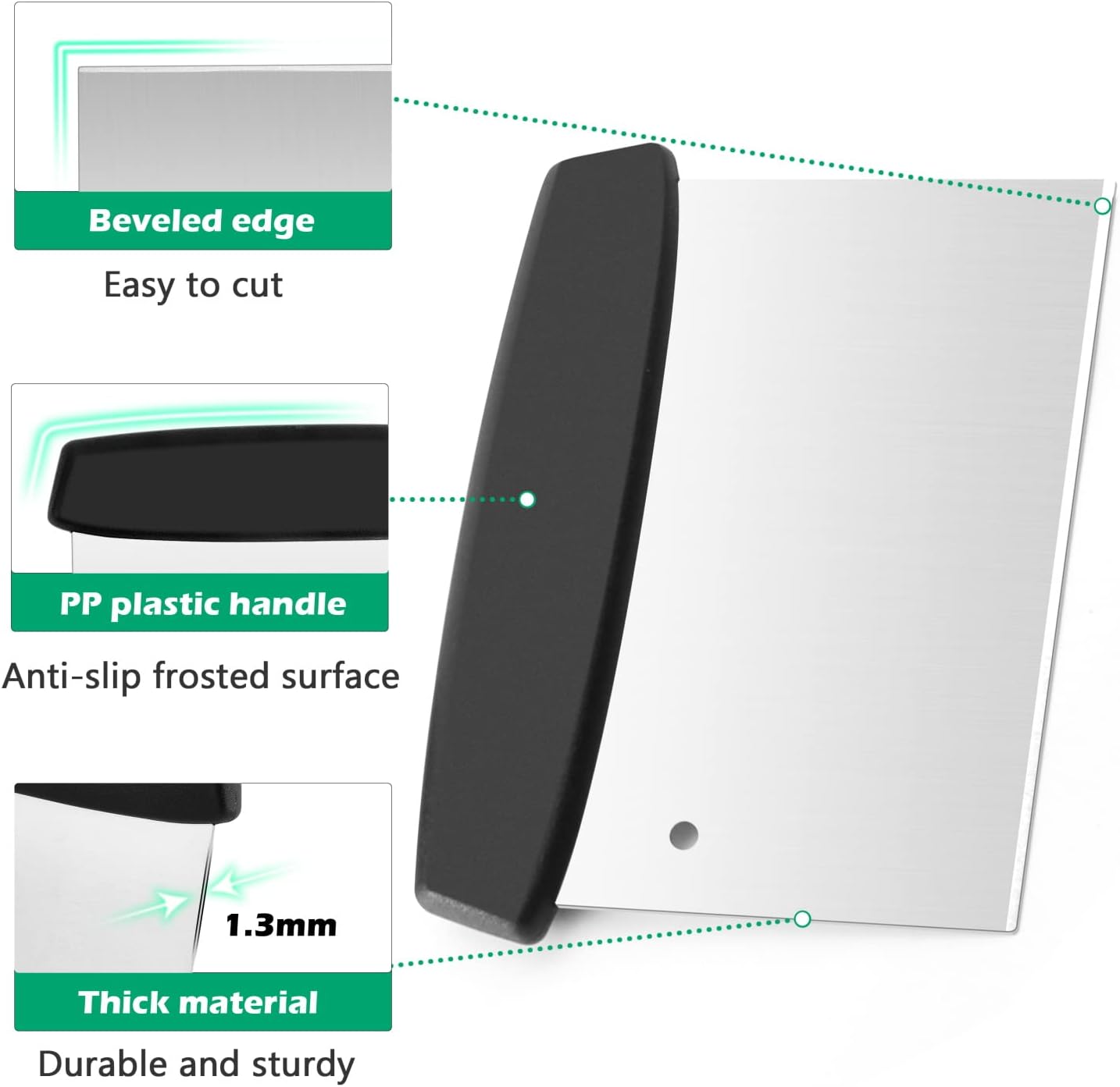 - SUPERIOR SCRAPER SET: Made of high-quality stainless steel and PP plastic, durable and sturdy, 1.3mm thick material, won’t easy to bend or broken, Mirror finished food-grade surface, avoid getting food on the chopper, Dishwasher support, easy to clean, also save time from housework
