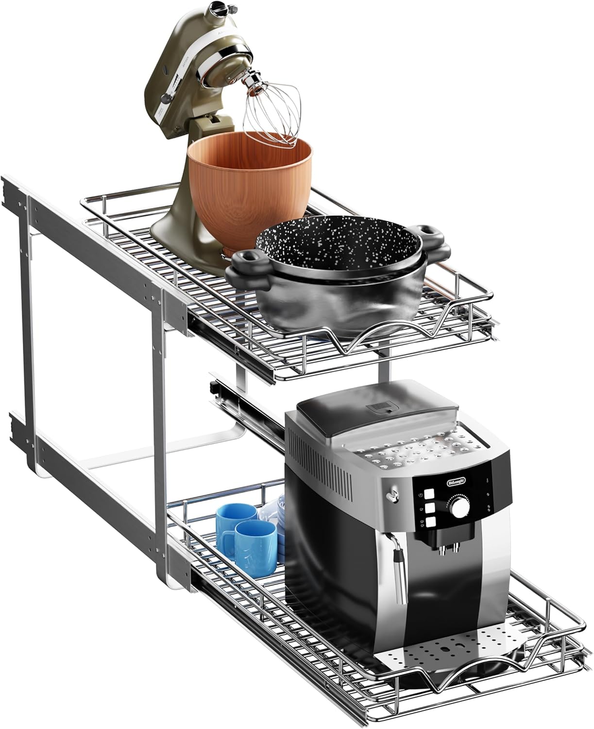 - 2-TIER PULL OUT CABINET ORGANIZER: Maximize kitchen space with dual pull-out shelves that slide independently for full-extension access. Easily organize cookware, pantry items, or cleaning supplies in hard-to-reach cabinets.