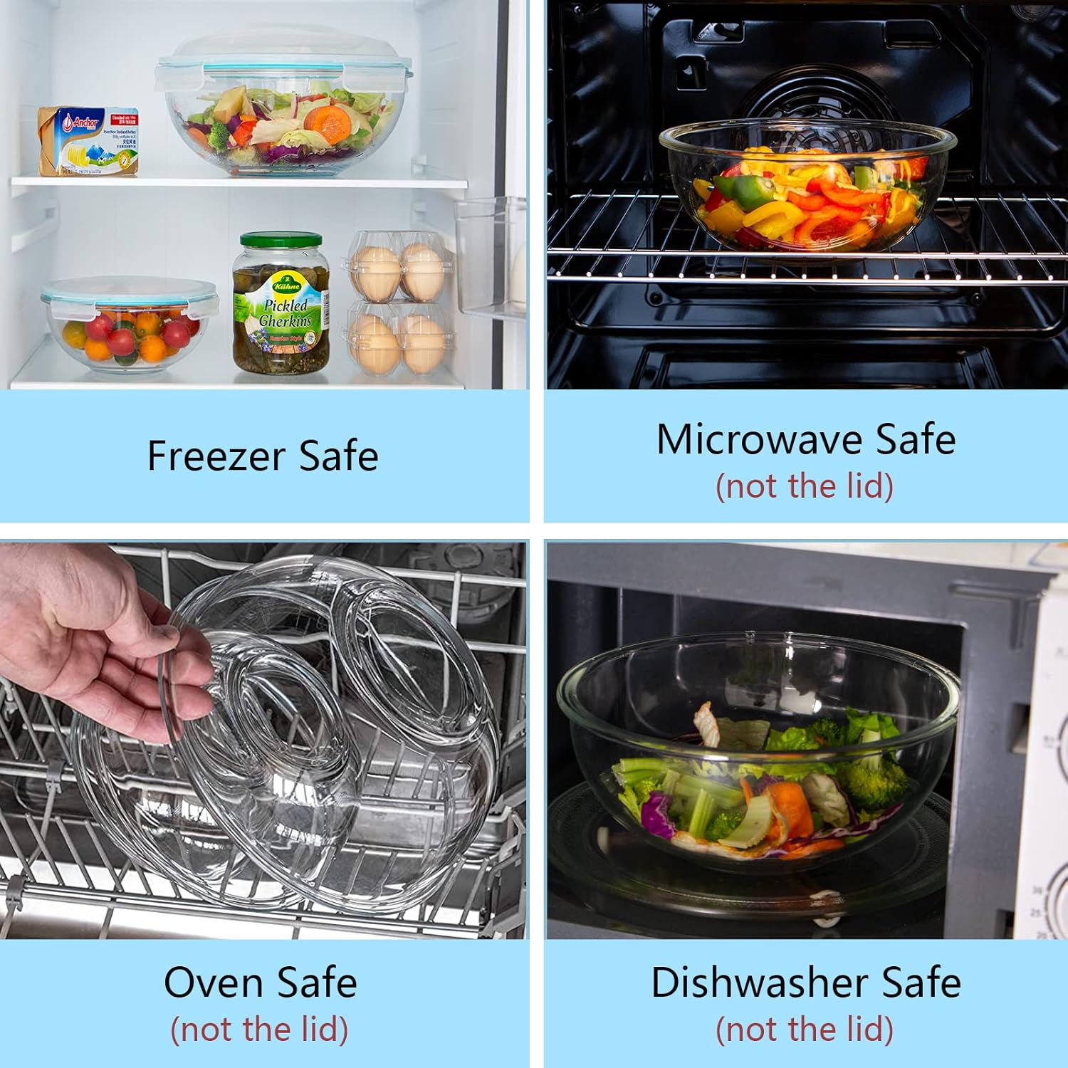 - Safety Materials: Bowls are made of high borosilicate material, lead & cadmium free, and tolerates -4℉-1040℉ (-20℃-560℃), access to microwave, oven, fridge, dishwasher. The lid is BPA free, safe and reliable, easy to clean.