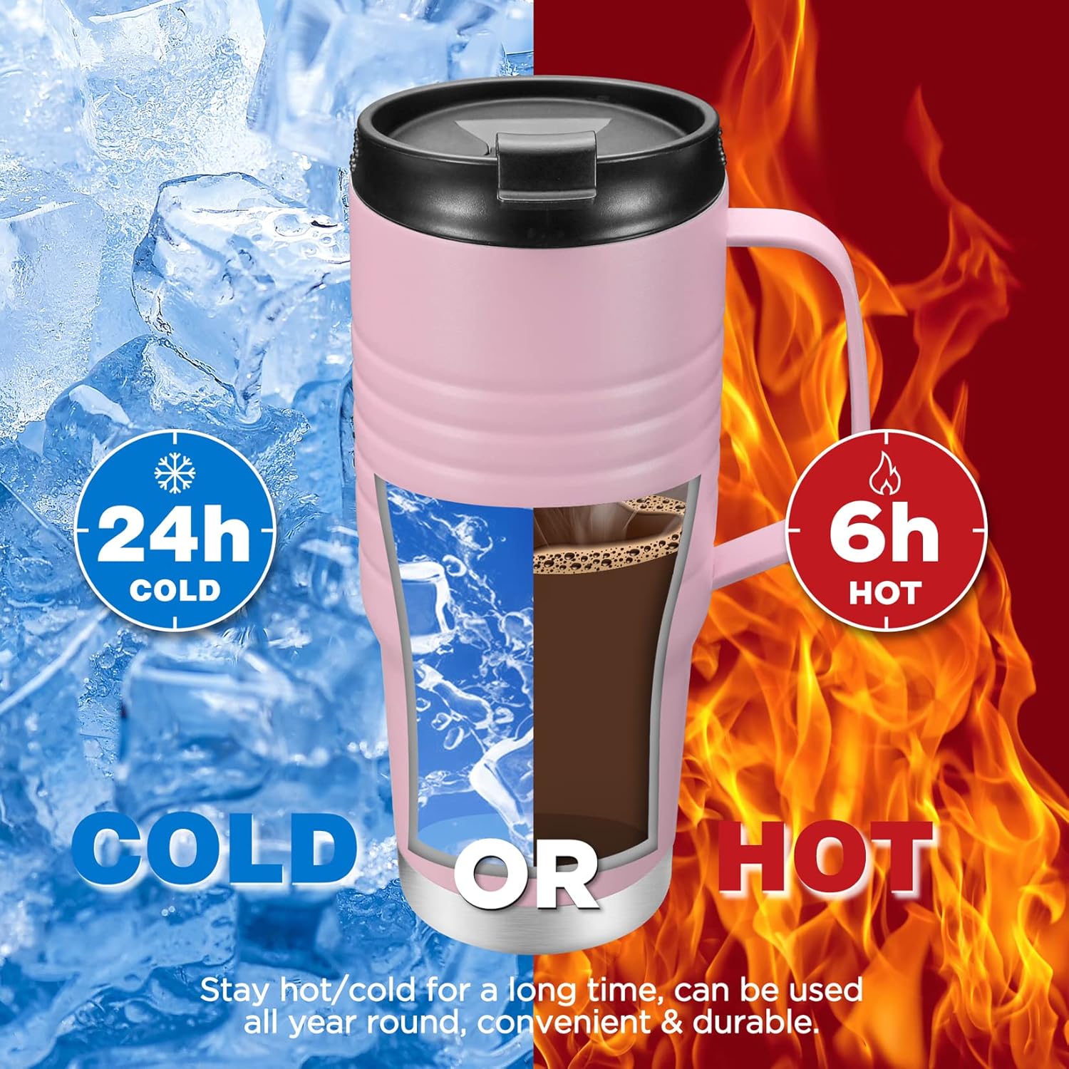 - UPGRADED STAINLESS STEEL HANDLE: The handle is upgraded to stainless steel, which will not come off; The handle design is ergonomic, large or small hands are comfortable to hold the coffee travel mug; Anti-scalding handle, more reassurance to use; In the cold winter, it can bring you steaming warmth, and in the hot summer, it can also get you a refreshing and cold feeling