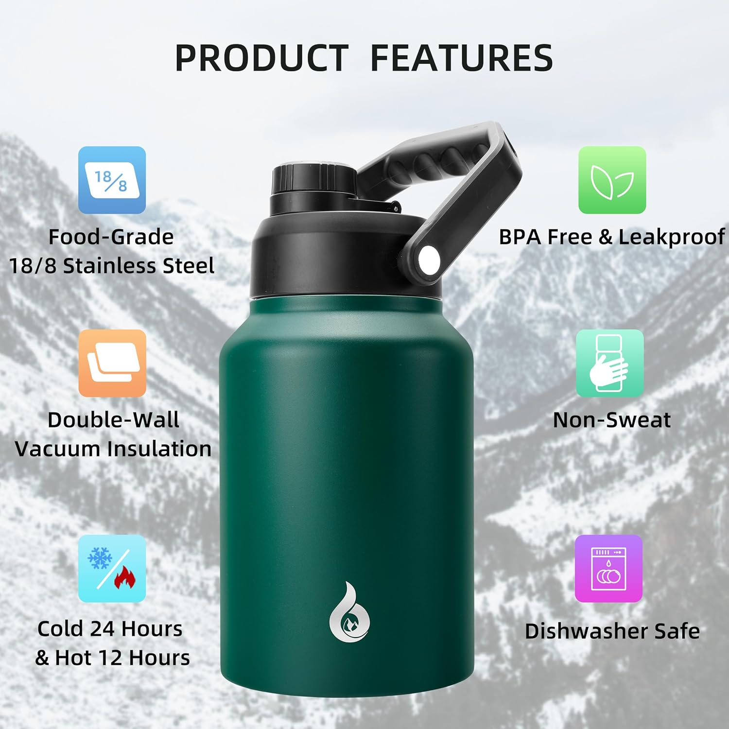 BJPKPK 64 oz Insulated Water Bottle, Dishwasher Safe Half Gallon Water Bottle with Ergonomic Handle, BPA Free Leak Proof Water Jug for Sports, Metal Thermos with Anti-slip Bottom, Army Green