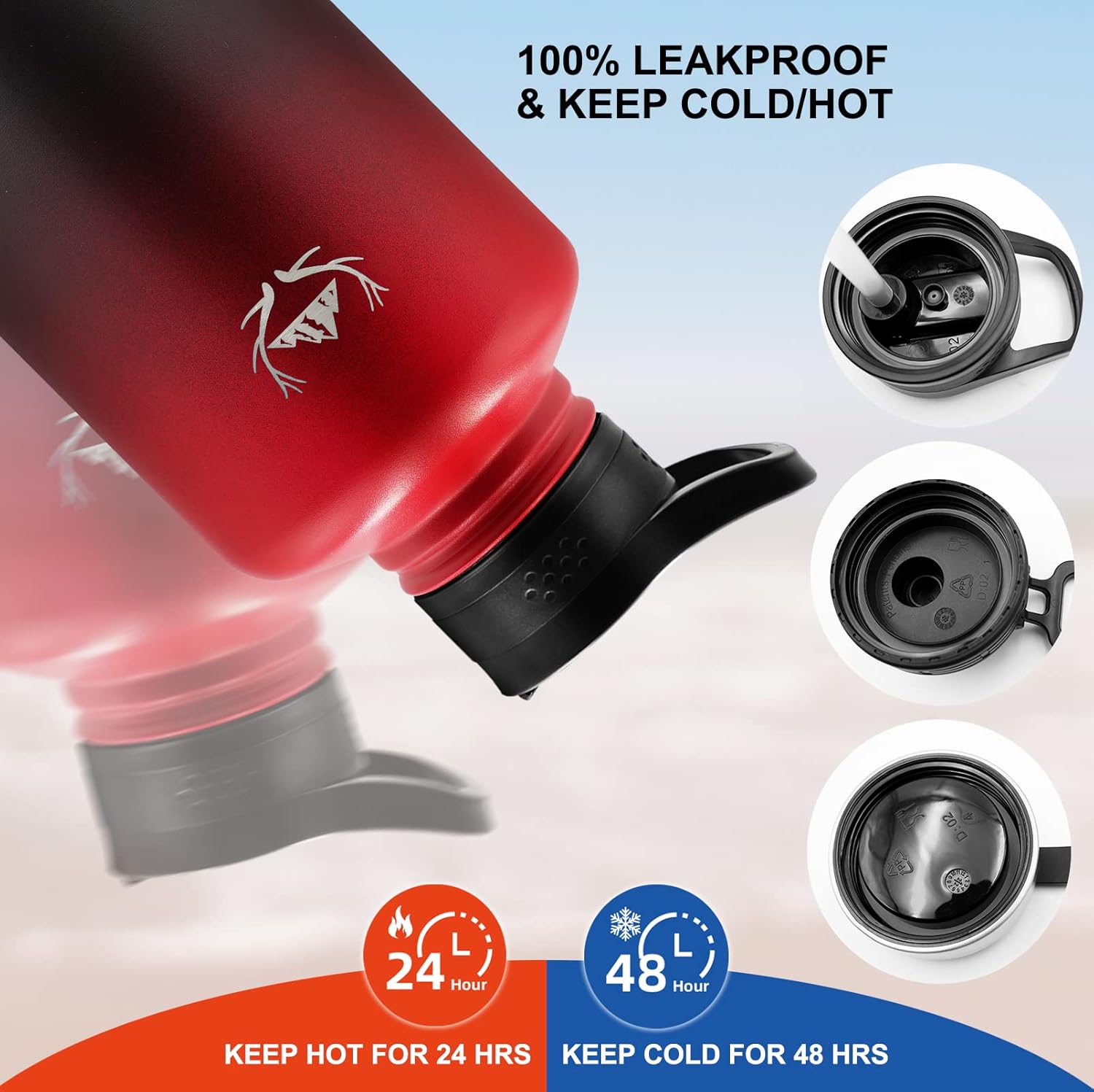 - 【Triple-Layer Vacuum Insulation】 – This insulated water bottle is engineered with triple-wall, vacuum-sealed insulation and made from premium 18/8 food-grade stainless steel. This advanced design locks in temperature, keeping drinks ice-cold for up to 48 hours or steaming hot for up to 24 hours. The no-sweat exterior prevents condensation and protects your hands from heat or frost, making it reliable for outdoor sports, travel, camping, and daily hydration