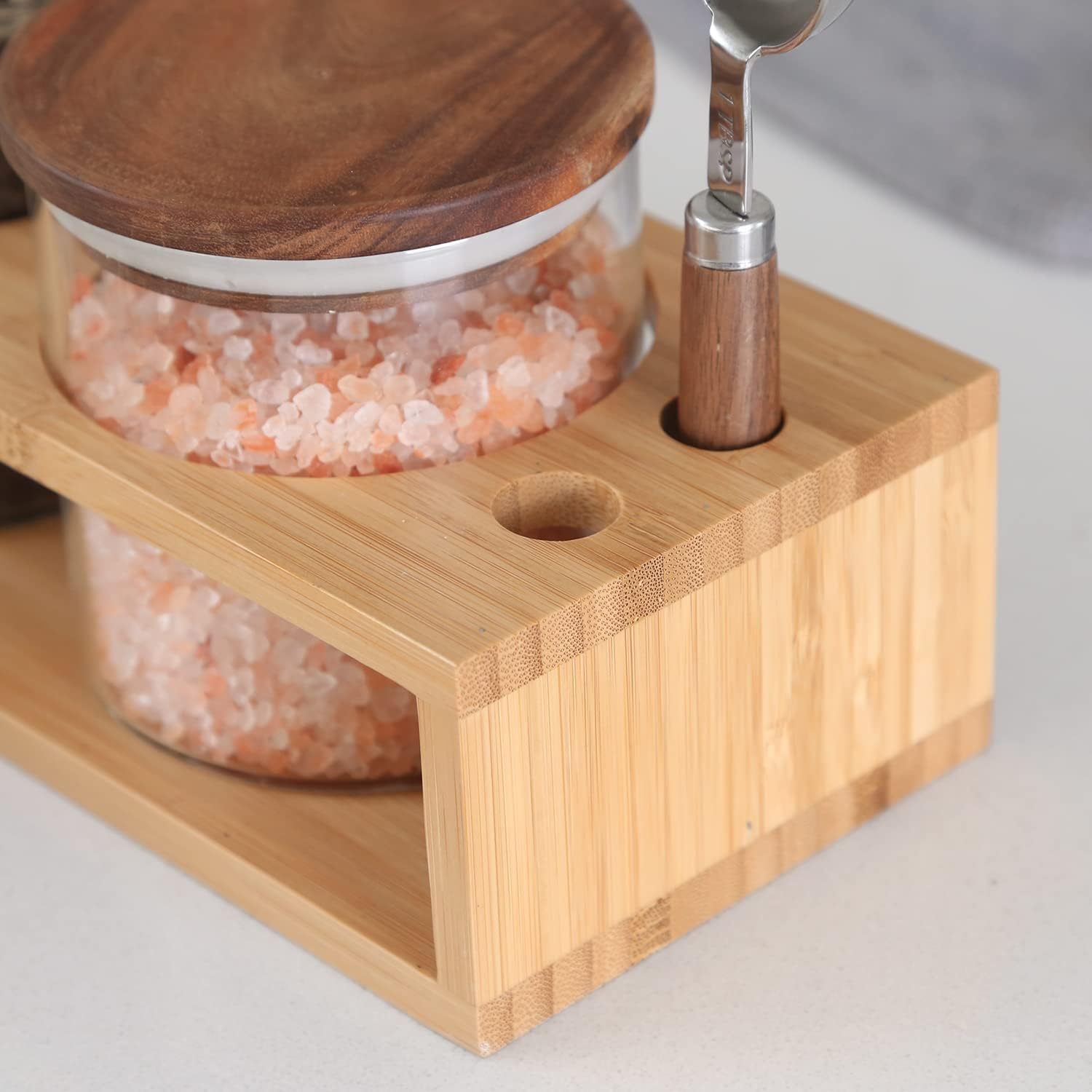 - Complete Set Includes:2 glass sealed jars (Height 3.77'' x Diameter 3.74'',Capacity:18fl oz/550ml),2 wooden handle scoop(1 TBSP) and 1 bamboo rack(10.24'' x 4.5'' x 2.76'' ,L x W x H).