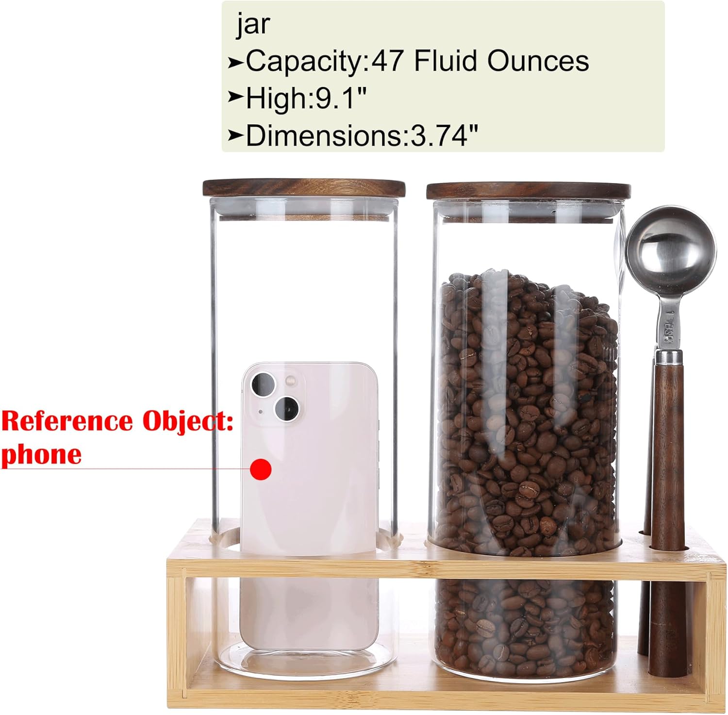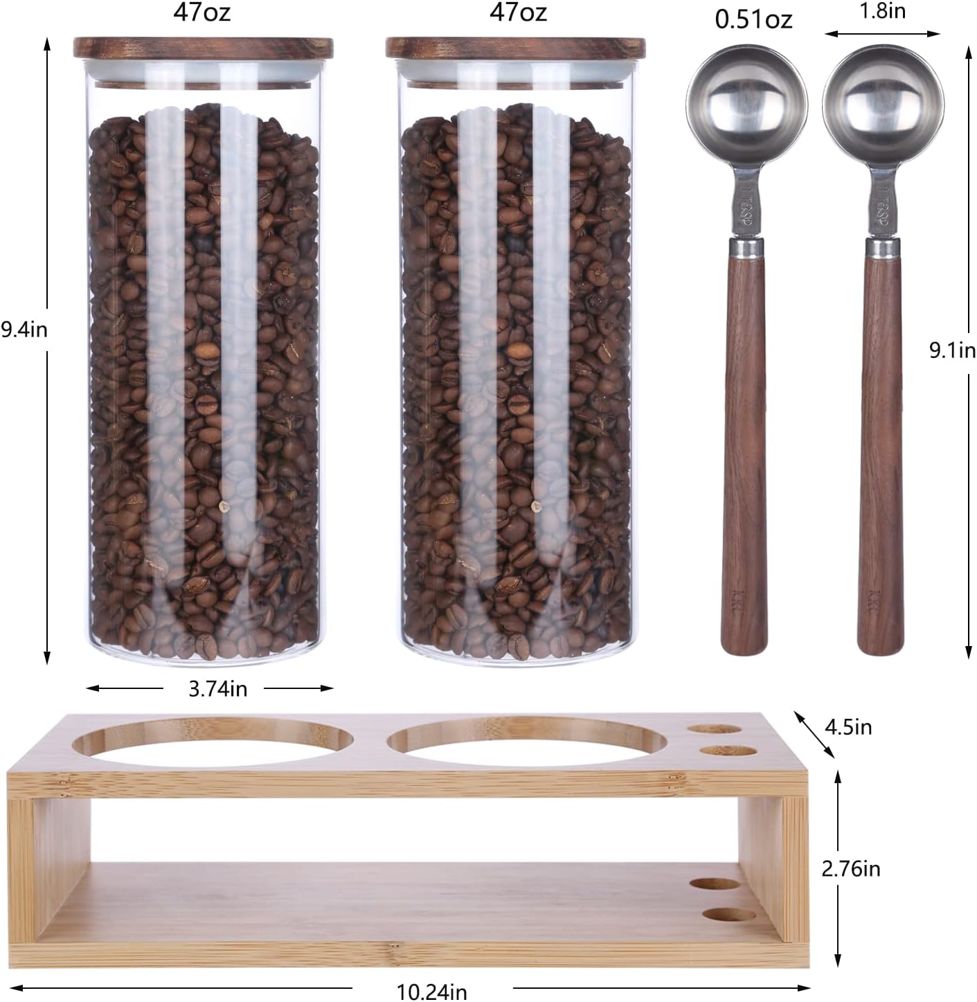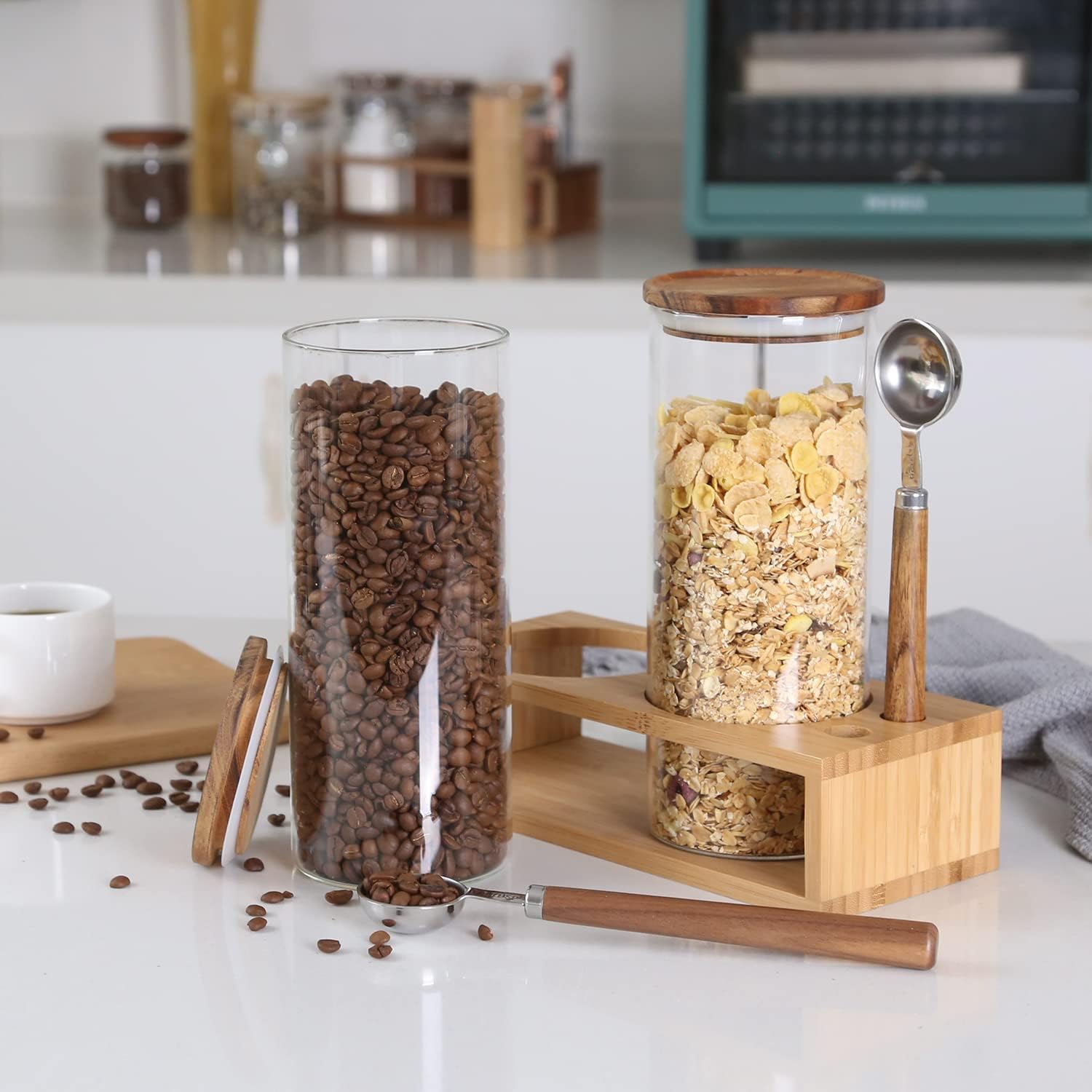 - Complete Set Includes:2 sealed glass jars(height 9.4" x diameter 3.74",capacity:39 floz/1150ml),2 wooden handle scoops(1 TBSP) and 1 bamboo rack(10.24" x 4.5" x 2.76",L x W x H),label stickers.