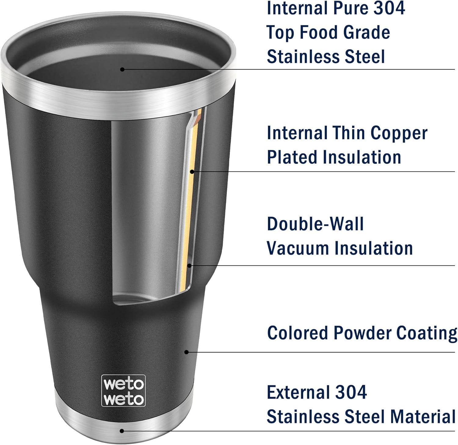 WETOWETO 30oz Insulated Tumbler With 2 Lids and 2 Straws, Stainless Steel Double Vacuum Coffee Tumbler Cup with Handle, Powder Coated Travel Mug for Home, Office, Travel, Party (Black, 1 Pack)