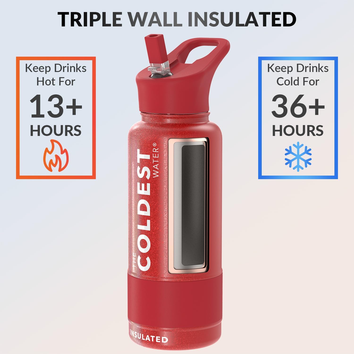 - 𝐀𝐃𝐕𝐀𝐍𝐂𝐄𝐃 𝐈𝐍𝐒𝐔𝐋𝐀𝐓𝐈𝐎𝐍 𝐓𝐄𝐂𝐇𝐍𝐎𝐋𝐎𝐆𝐘: Coldest reusable water bottles are your solution to tepid sips. With the world's first fully insulated straw lid, this bottle keeps your drink cold for 36+ hours and hot for 13+ hours, ensuring your drink stays at the perfect temperature throughout the day. Cold-tested against 50+ leading brands, its superior performance guarantees an unmatched experience. Upgrade now to the Coldest Water Bottle and bid farewell to temperature woes.