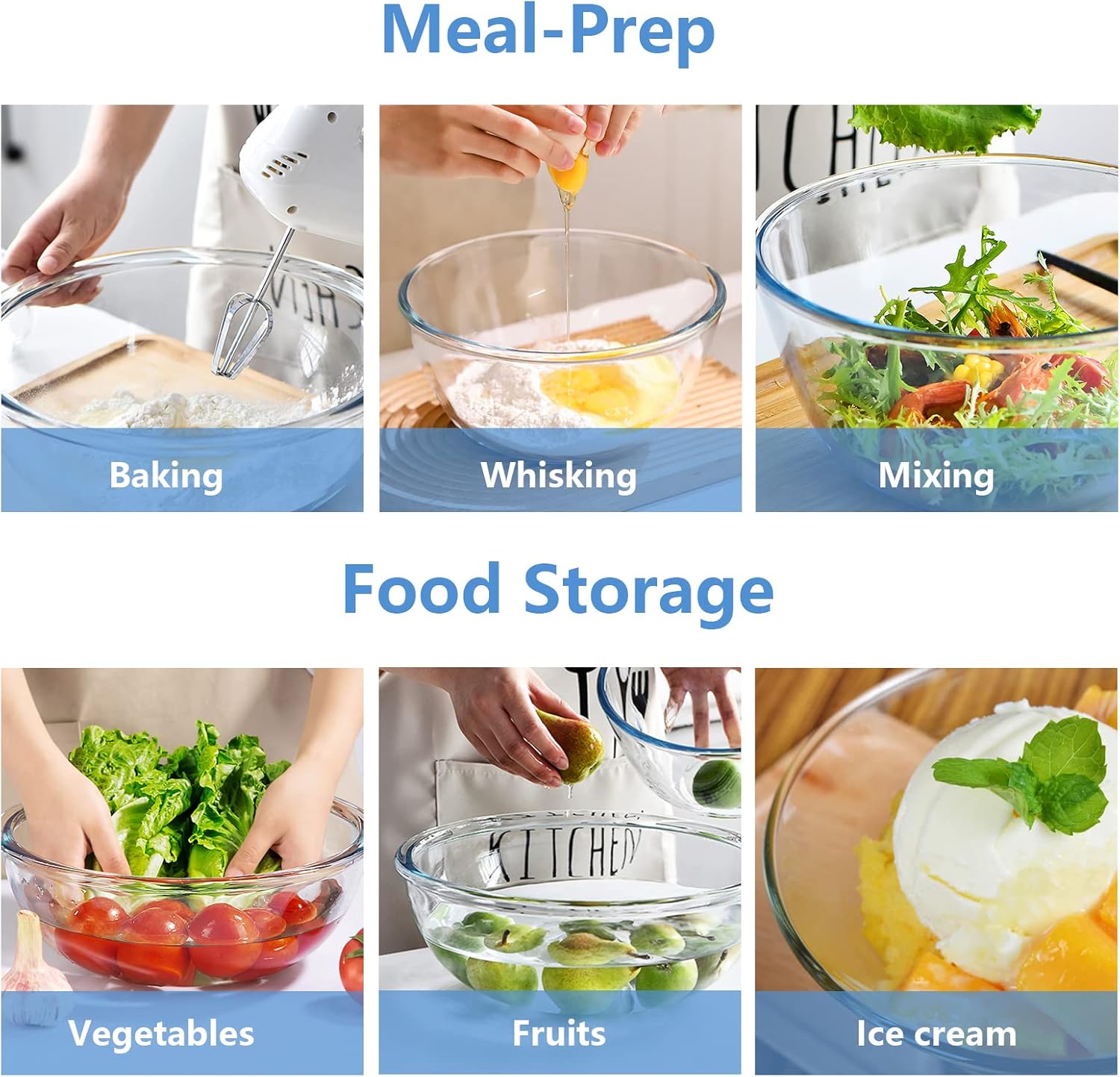 - Non-slip Edge & High Thickness Design: The anti-slip edge is designed for better grip, which makes it more easily while mixing , pouring or cleaning .The heavy duty glass make them more stable when kneading or whisking.
