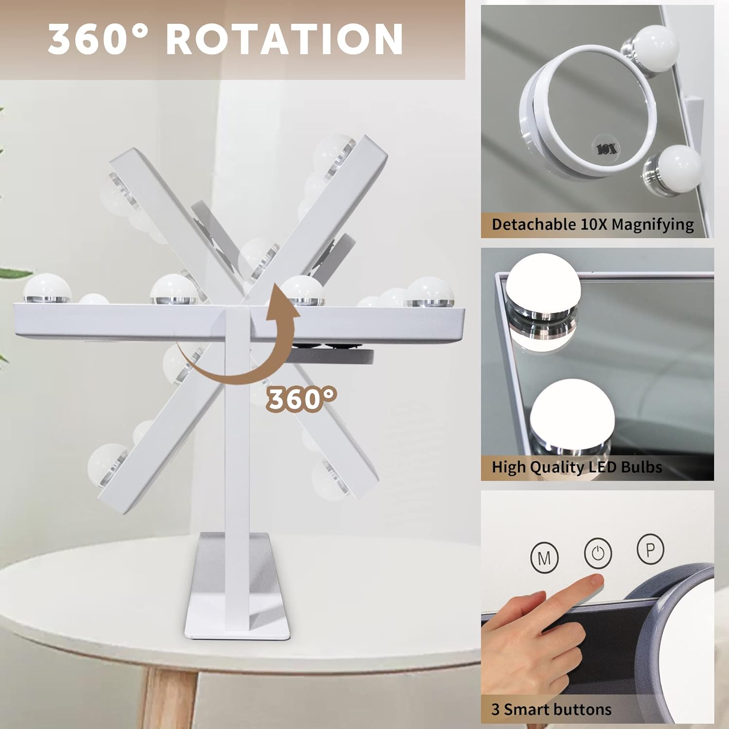 - 【Adjustable Brightness and 3 Color Lighting Modes】The vanity mirror comes with 12 LED bulbs and has 3 color modes:White/Natural Daylight/Neutral White modes via touch controls ,allowing you to adjust different brightness levels to meet your various makeup needs,achieve salon-perfect makeup matching any environment from golden hour sunsets to studio photography sessions.