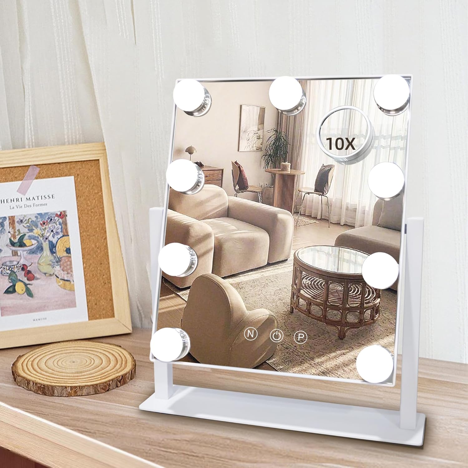 Hollywood Vanity Mirror with Lights, 9 Dimmable LED Bulbs Lighted Makeup Mirror with Detachable 10X Magnification Mirror, 1200mAh Rechargeable, 3 Color Lights, Gifts for Women Mom Teen Girls