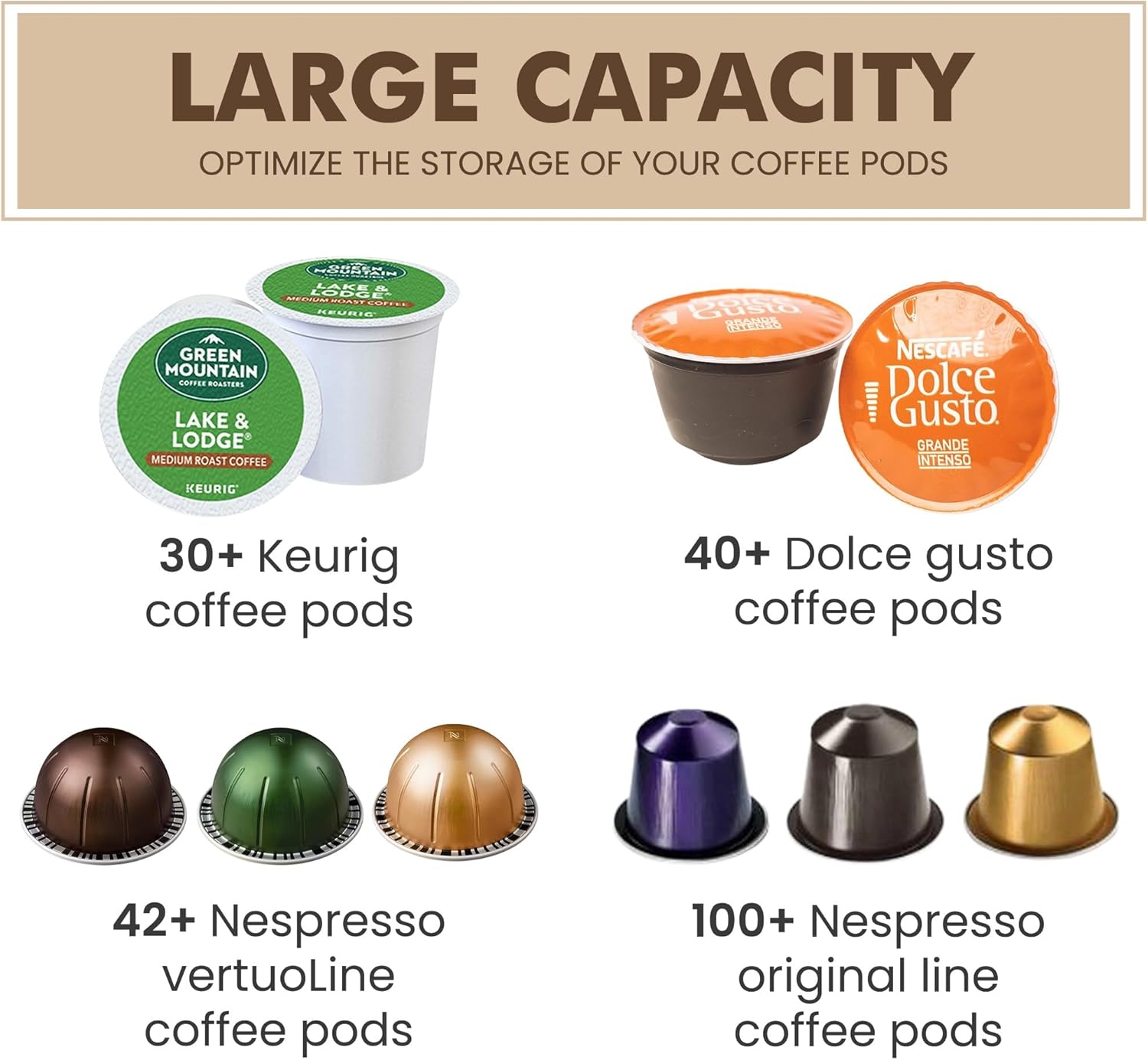 - VERSATILE STORAGE: Compatible with most major coffee pod brands including K-cups and espresso capsules for flexible organization